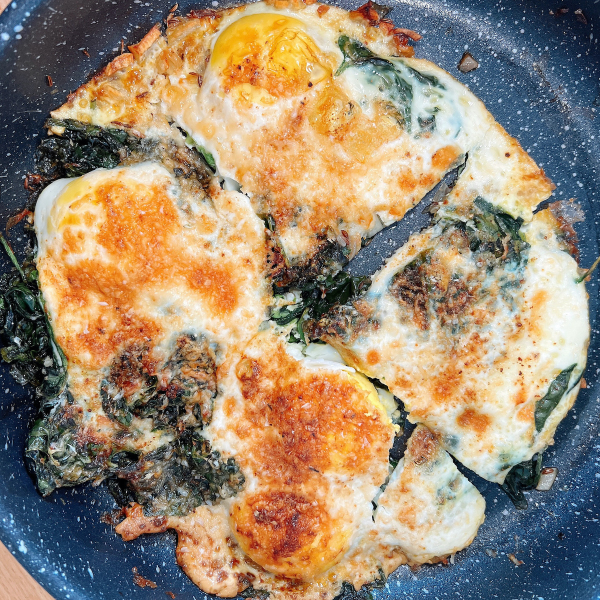 – quand les épinards ont réduit et avant que l’ail ne brunisse on y casse nos oeufs