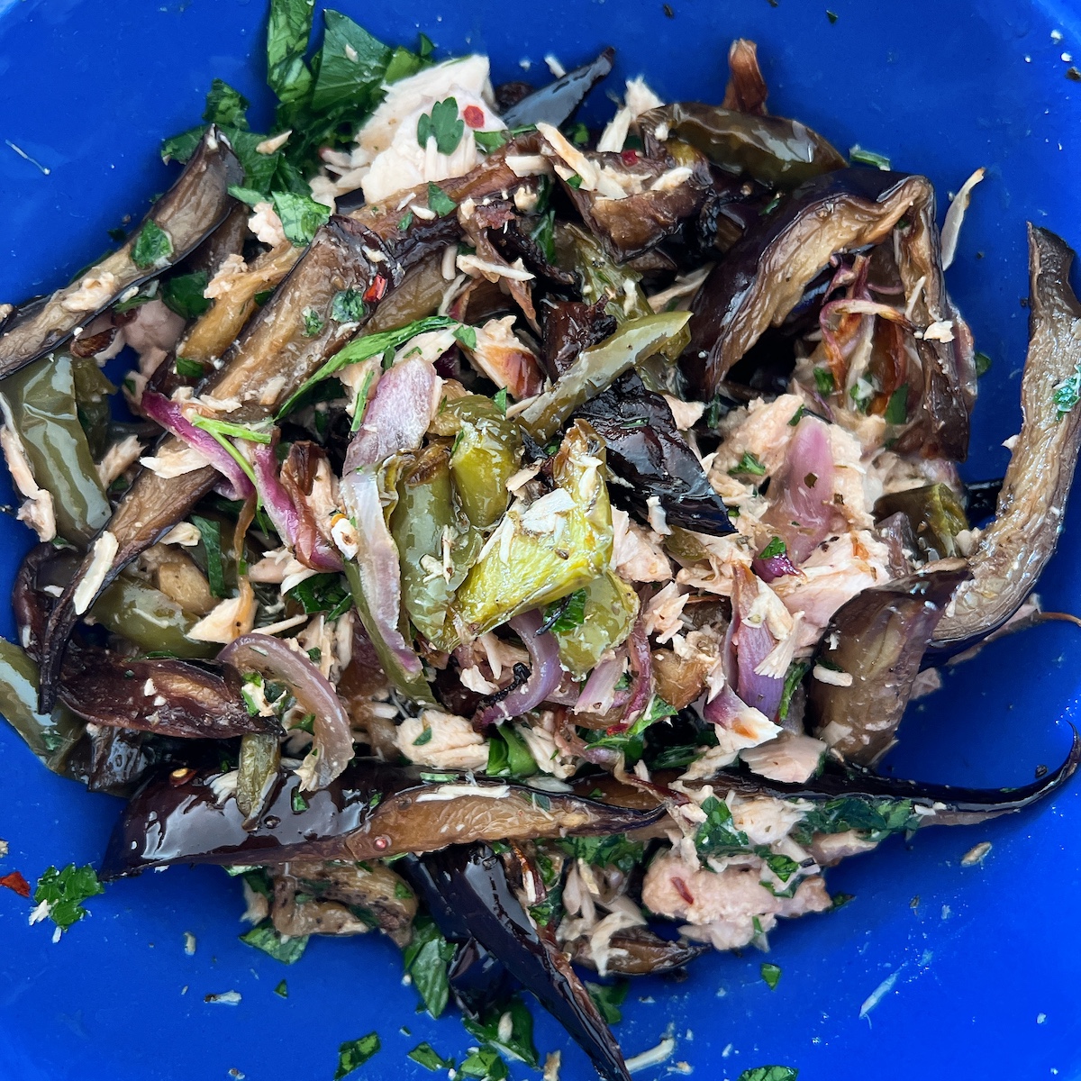 J’ai mis tout dans un gros saladier, ajouté de l’huile d’olive (généreusement), de la fleur de sel, de l’origan et j’ai tout bien mélangé.