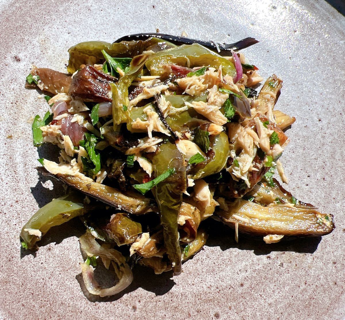 J’ai ensuite ajouté à la salade le thon que j’avais pré-découpé au couteau dans la boîte avec le jus de la boîte (très important). J’ai le tout mélangé avec du persil que j’avais émincé et des flocons de piment, un délice.
