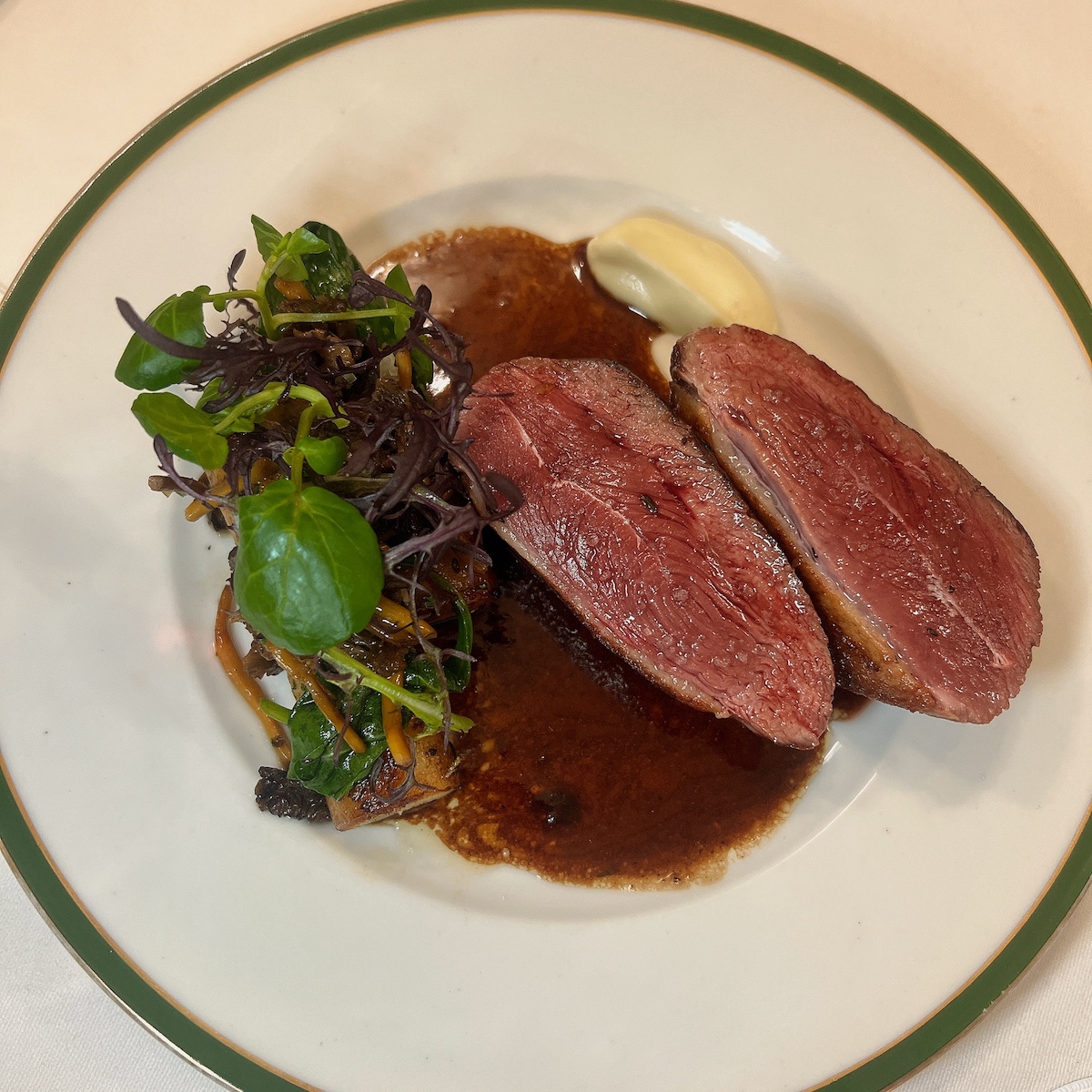Magret de canard rôti, jus au porto, purée de céleri-rave, légumes verts 26€