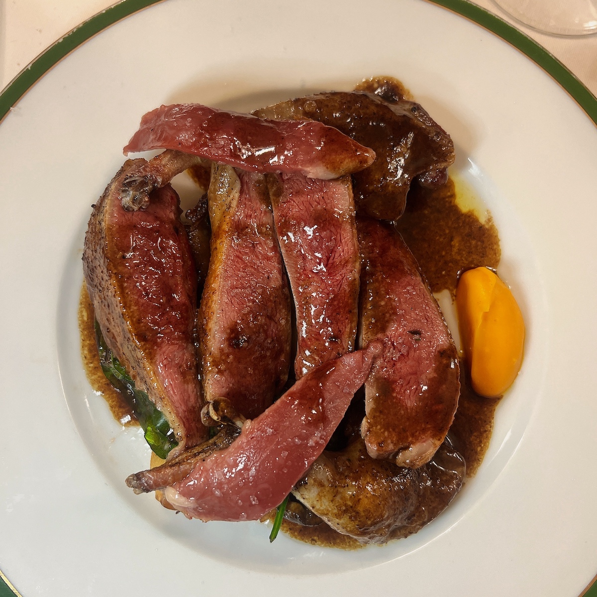 magret de canard, pigeonneau, 2 salades vertes, 1 assiette de fromages et 1 bouteille de Côte de Brouilly Château Thivin