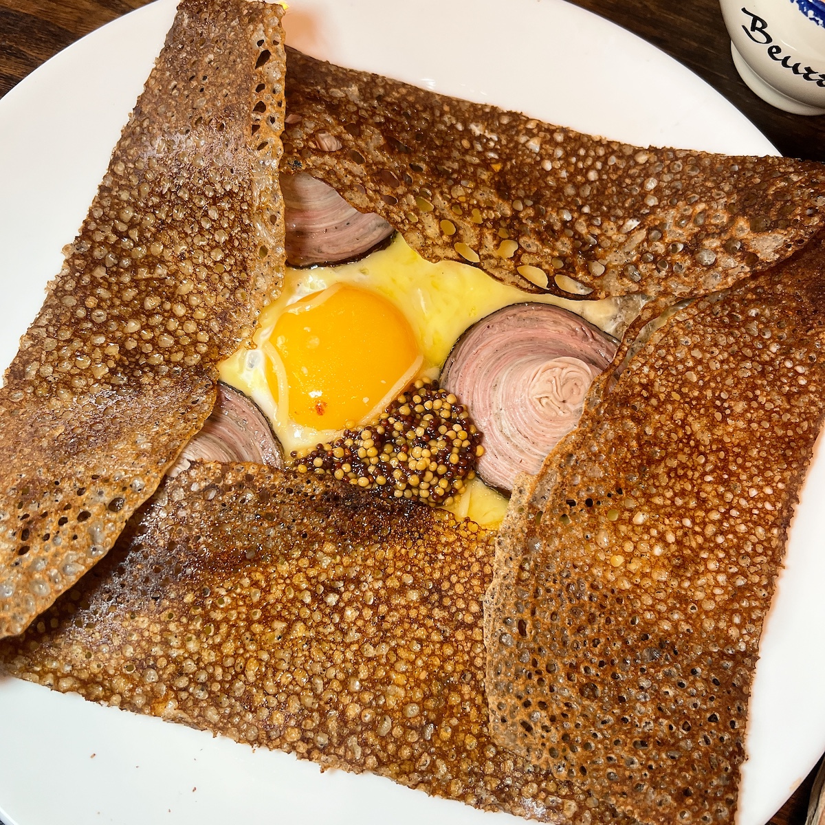La Doudou, crêpe à l’andouille, est magnifique et le goût est au diapason, elle est parfaite, craquante, gourmande, savoureuse et équilibrée, les graines de moutarde apportent l’acidité nécessaire au gras de l’andouille, à l’oeuf et au fromage fondu.