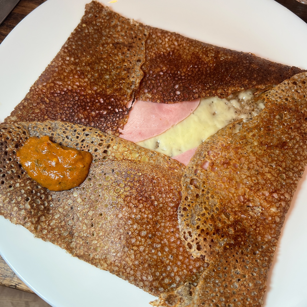 Pris cette crêpe à l’andouille avec graines de moutarde et algues, bien, très bonne et original, il manquait peut-être un poil de liant entre les ingrédients mais rien à dire et la crêpe elle-même est nickel.