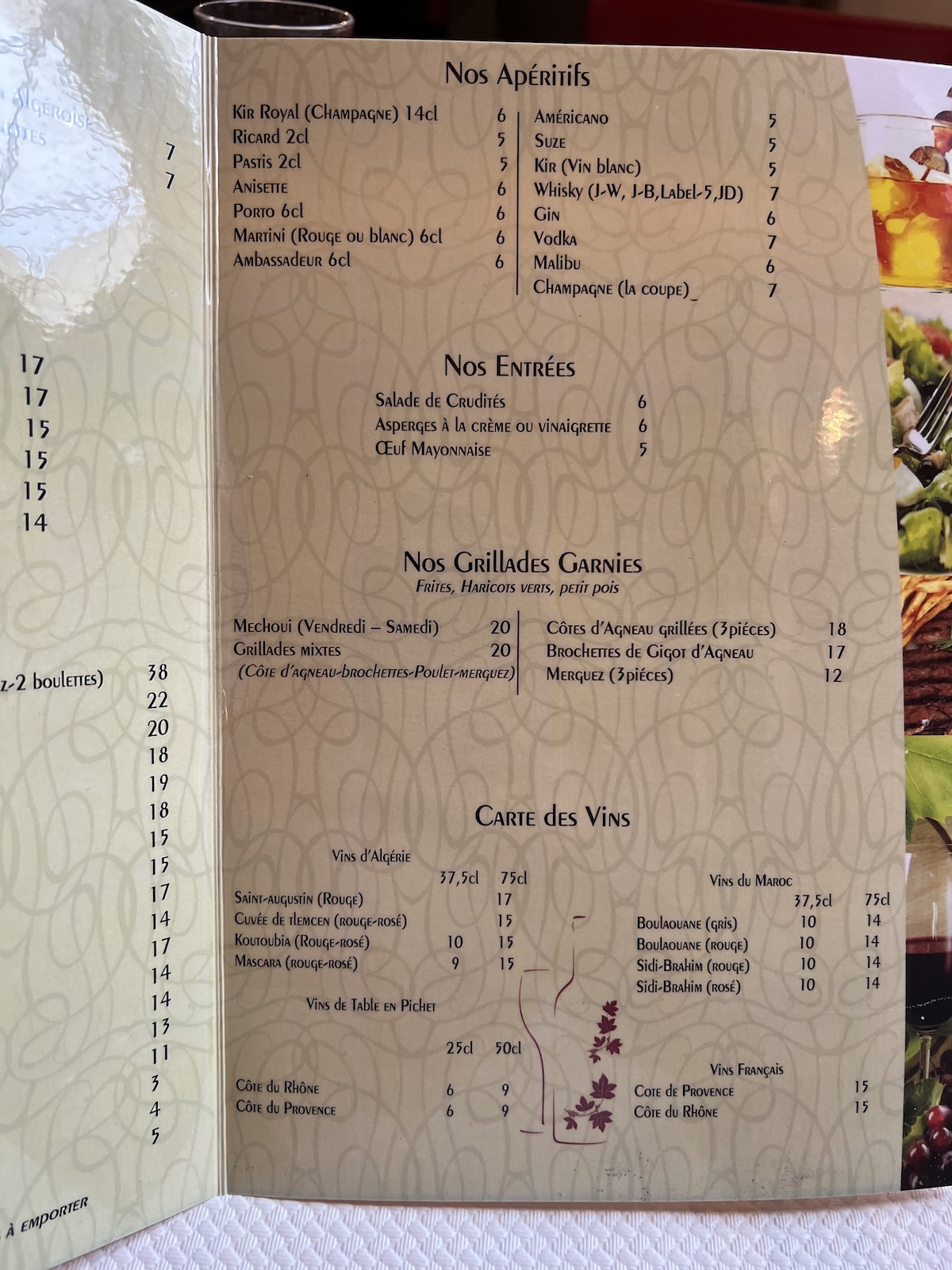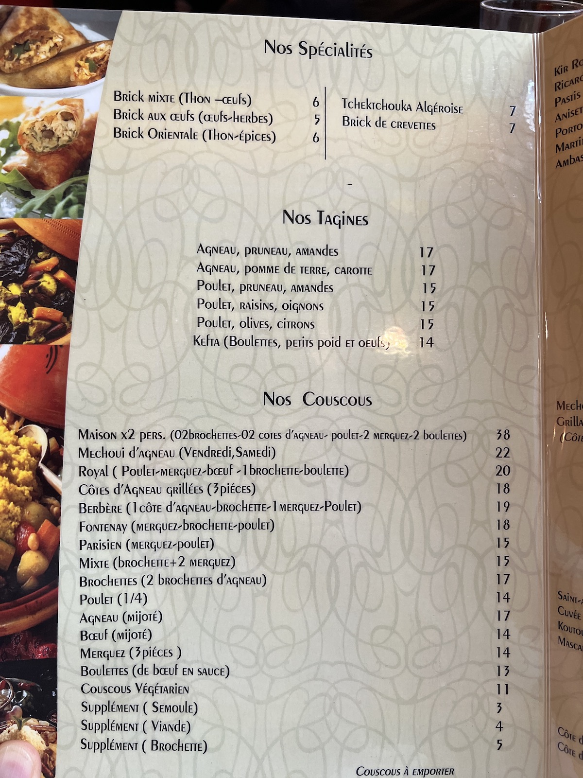 Le resto a, tenez-vous bien, 42 ans, il y avait ce jour-là en cuisine la maman et la soeur du monsieur en salle et en salle donc, le monsieur; mais j’ai su après qu’il y a en fait un chef qui prépare le couscous.