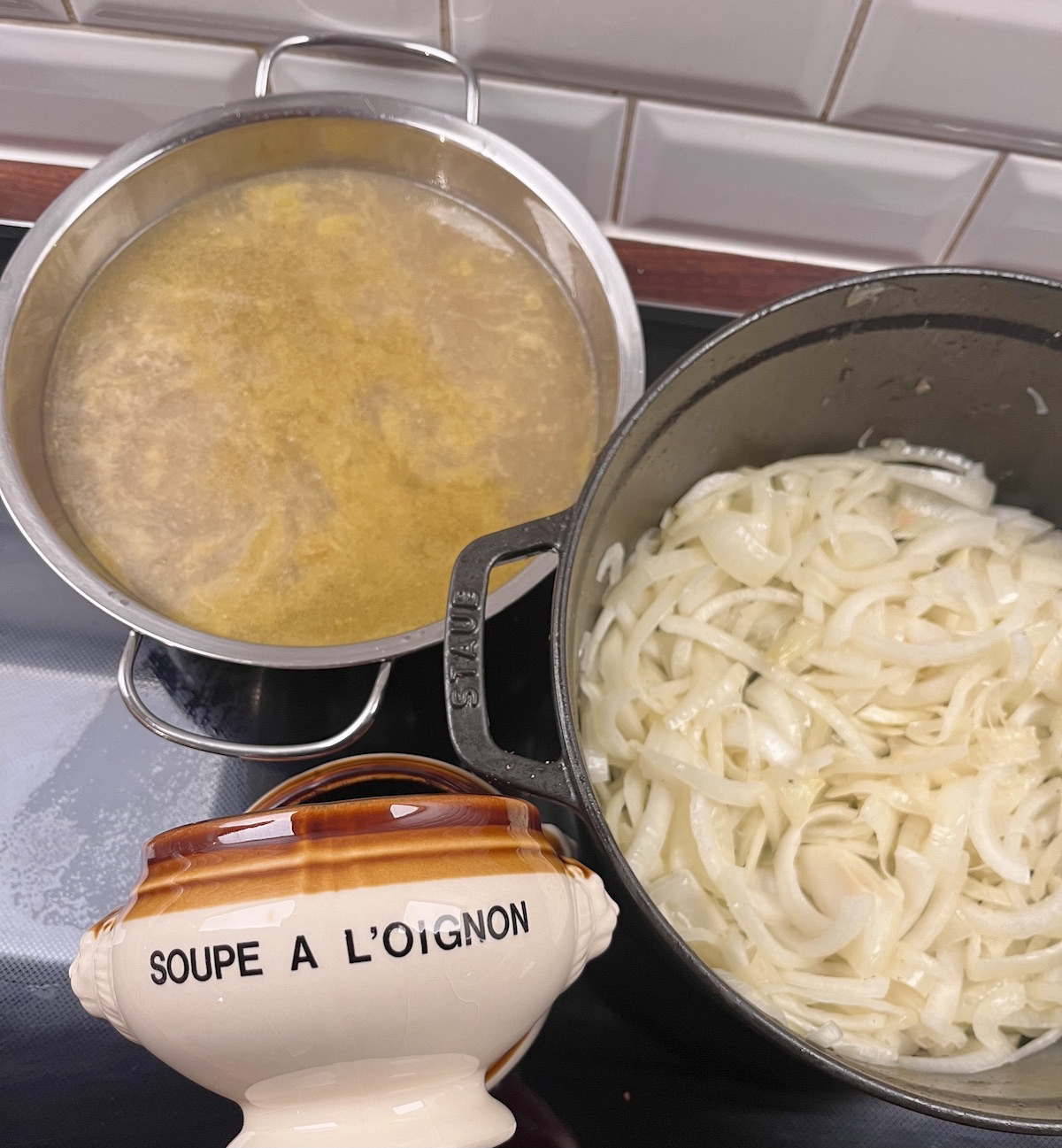 Un lecteur, Quentin, m’a donné sa recette ainsi que ses photos : “je fais réduire les oignons sans coloration, je singe avec de la farine et j’ajoute un bouillon de volaille ou fond de veau + eau et je laisse prendre à feu doux avec un tout petit bouquet garni. Passage sous grill avec pain et emmental.”