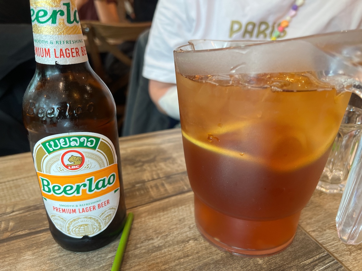 Une bière Lao qui, contrairement à ce que laisse entendre la photo du menu, n’est pas disponible à la pression, ça m’étonnait aussi. Une grande carafe de thé glacé.