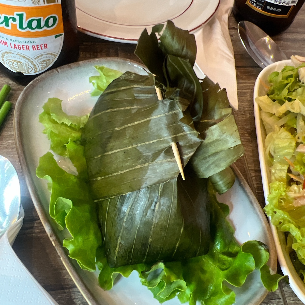 J’ai demandé si c’était comme du poisson Amok, le monsieur m’a expliqué que là c’était la recette laotienne, qu’elle se différenciait entre autres par le fait qu’elle n’utilise pas de curry vert mais du curry vert (si j’ai bien compris).