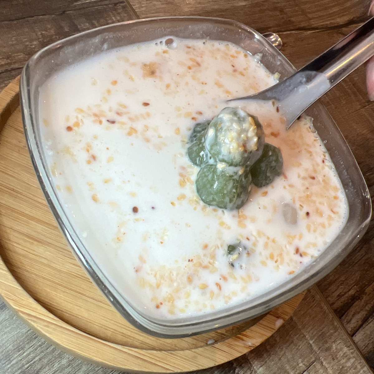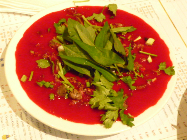 C’est sûr qu’on a eu le fils de la chef comme serveur et ça, ça joue. L’autre serveur était sympa mais moins au taquet sur les conseils puisque lorsqu’au début du repas je lui ai demandé ses recommandations s il m’a dit : “bougez pas, je vous apporte la carte avec les photos.” En discutant avec la dame qui était à la caisse, elle m’apprend qu’elle est la soeur du serveur et donc la fille du chef, qu’auparavant ils possédaient Lao Doulang Chan, qu’ils l’ont vendu il y a 6 ans, qu’elle a fait une pause pour élever ses enfants et que les voilà revenus dans ces nouveaux lieux. J’ai vraiment aimé mon passage dans ce restaurant et j’ai très envie d’y retourner. En sortant je tombe sur une table de 4 jeunes près de la porte qui avaient tous ce genre de gaspacho et je leur demande ce que c’est : “c’est du sang de porc”. J’ai encore du chemin avant de pouvoir jouer les warriors de la cuisine asiats.