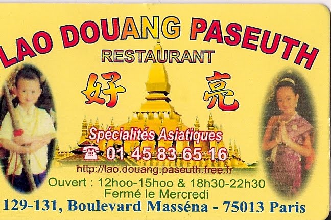 2011 C’est la même amie qui m’avait recommandé Lao Chaleune et Lao Doulang Chan qui m’a branché sur ce Lao Doulang Paseuth et Lao Thaï. Vendredi dernier je pars tester Lao Thaï sauf que le temps d’arriver avec 10 min. de retard notre table pour 2 avait été donnée. En plus c’est con, alors que je garais mon scoot devant le resto, je voyais un couple hésiter sur le pas de la porte : ce sont eux qui ont eu notre bonne table près de la fenêtre. Le resto est petit, loin de tout et plein à craquer. Donc ça m’a un peu refroidi, on a attendu 10 min. mais je sentais qu’il fallait attendre encore un peu et en plus on ne savait pas quelle table se libérerait et je n’avais franchement pas envie de me retrouver coincé dans le fond de la salle comme c’était le cas pour certaines. Comme nous avions vu Lao Doulang Paseuth en venant et qu’on avait l’impression de pouvoir mieux y respirer, retour en scoot via Masséna jusqu’à Paseuth.