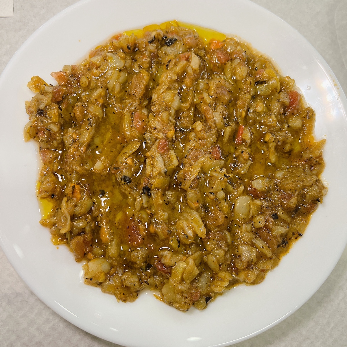 Une bonne méchouia maison bien pimentée comme on aime, le serveur a apporté spontanément l’huile d’olive comme ça se fait habituellement, une bonne baguette un peu épaisse, une méchouia relevée et la bouteille d’huile d’olive à dispo c’est comme ça qu’on commence un festin algérien.