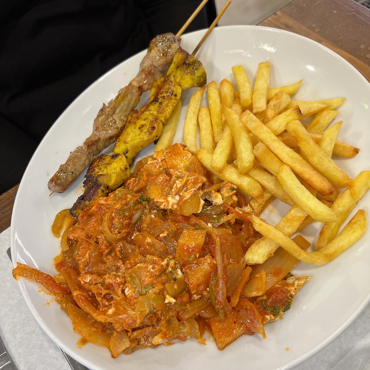 La personne qui était avec moi a pris brochette de veau et brochette de poulet au curry et en accompagnement chakchouka et frites maison. Dans les grillades algériennes, les frites sont souvent savoureuses et totalement maison, c’est le cas ici.