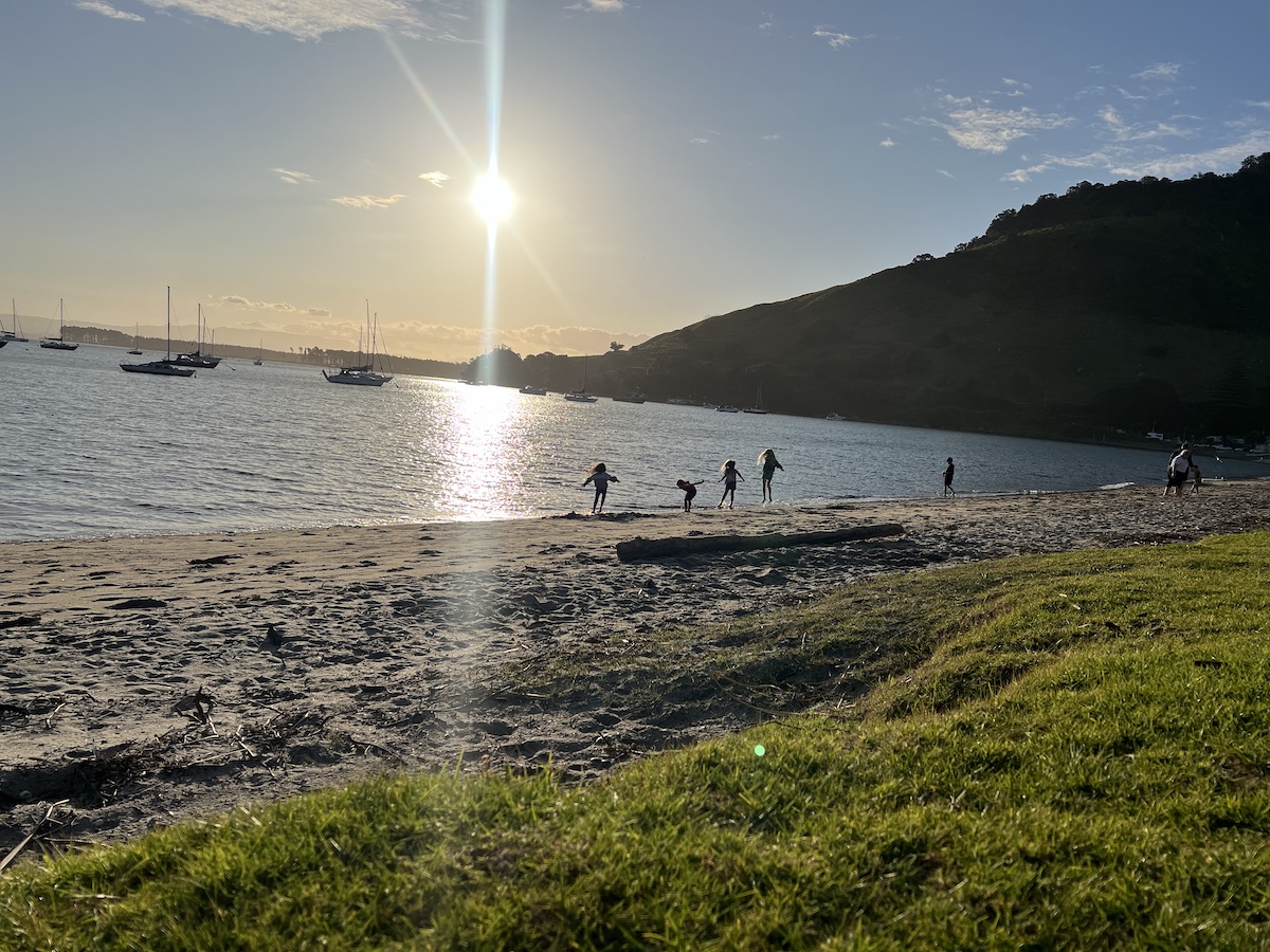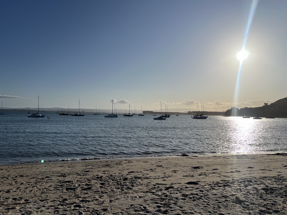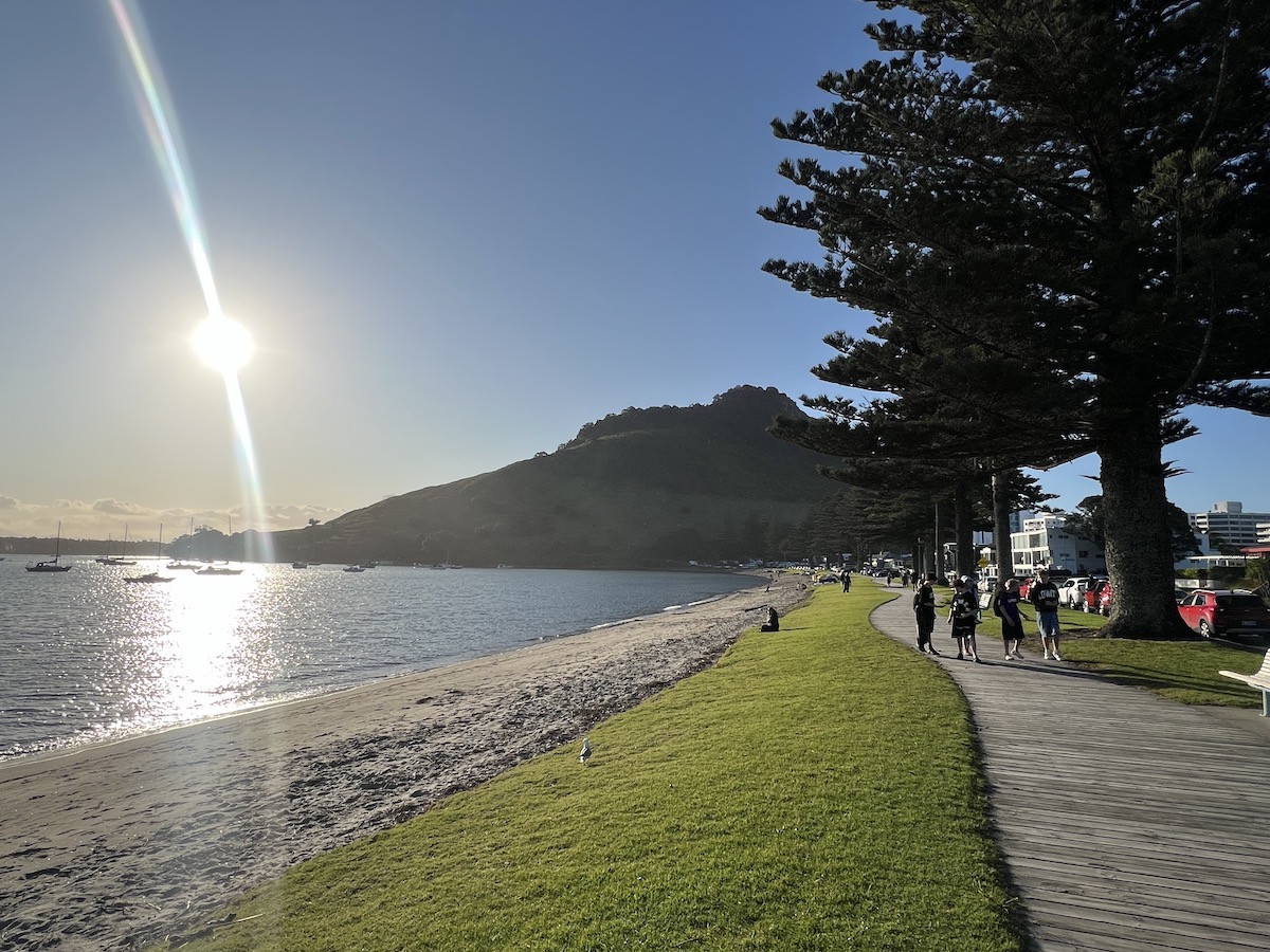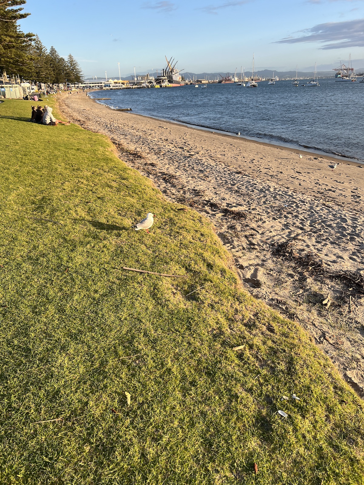 La petite plage offre un point de vue d’un côté sur le Mount Manganui et de l’autre sur le port industriel, j’aime beaucoup le mélange des deux.