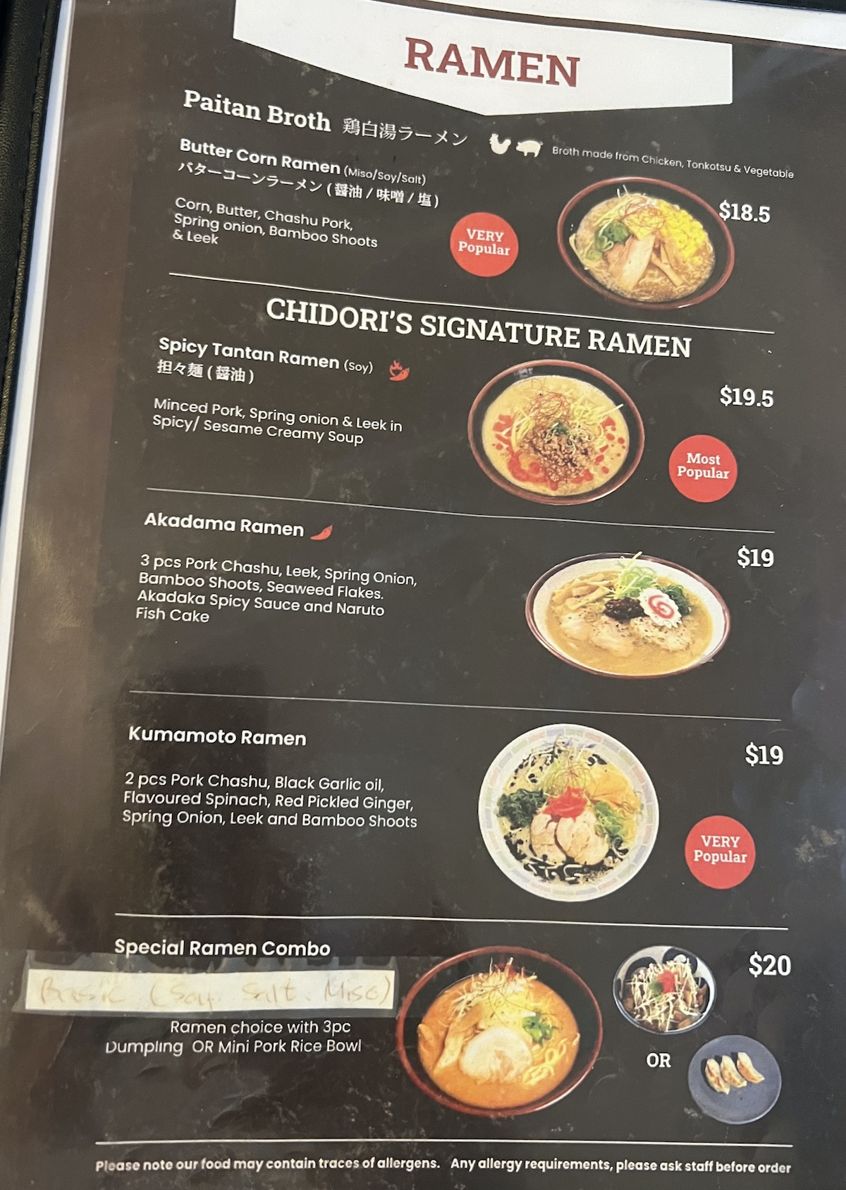 En photo un ramen chashu paitan avec sauce soja et un bouillon clair de poulet. Ca plus deux mocktails maison : 30€.