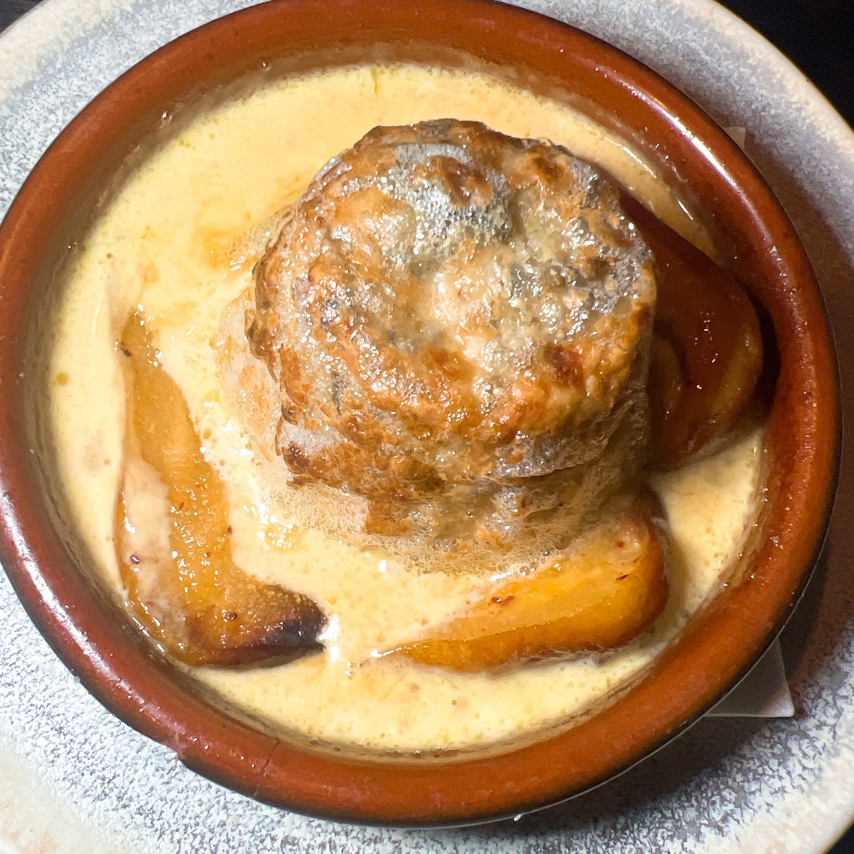 Soufflé au fromage cuit en deux fois avec des poires au paprika rôties au four