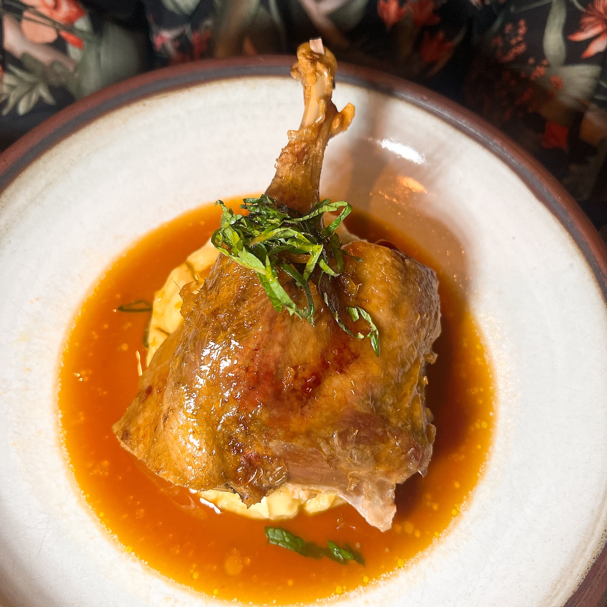 Canard fermier rôti au four, purée de Kumara parfumée à la vanille et à la noix de coco, sauce à l’orange