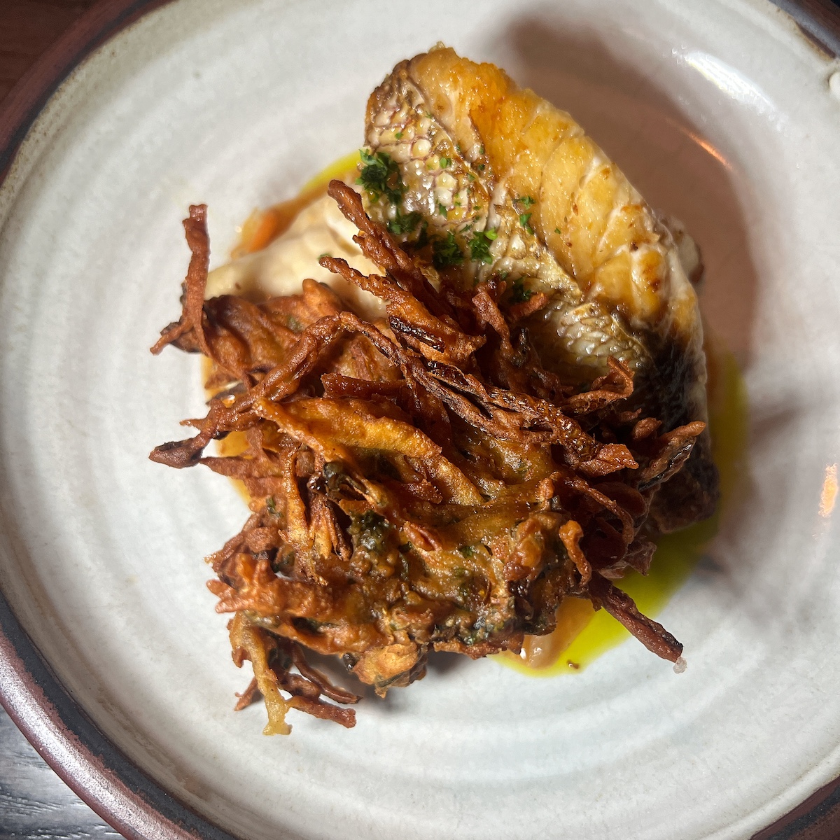Poisson pêché à la ligne, pakoras de pommes de terre, sauce au tamarin