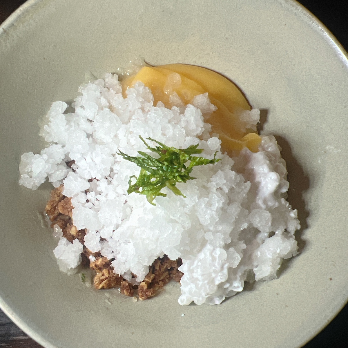 Crème de citron vert, noix de coco et sagou avec crumble d’avoine et granité à la menthe
