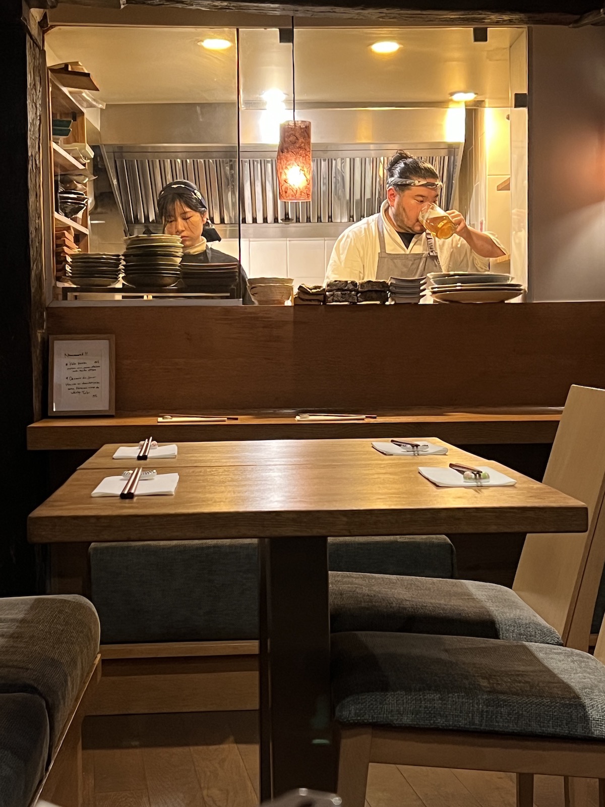 J’ai compris après en regardant leur site que le chef, Ryota Suzuki, est un ancien de feu Abri dans le 10ème (l’ancien chef principal d’Abri, Katsuaki Okiyama a monté depuis Minore dans le 9 avec le bartender Hugo Combe). Le site de Muku précise bien l’esprit du lieu : “Ryota vous accueille avec simplicité, dans une atmosphère conviviale et sincère. Il vous invite à découvrir l’art de l’Izakaya : des plats à partager, faits maison, inspirés par les saisons.” J’espère qu’il ne m’en voudra pas d’avoir pris une photo de lui en train de boire une bière, ça s’est fait comme ça et après tout, pourquoi diable le chef ne pourrait pas boire une bonne pinte à l’heure de l’apéro? Ils étaient donc deux en cuisine et en salle deux, elles étaient très douées j’ai trouvé, sympas et précises dans le service et les conseils.