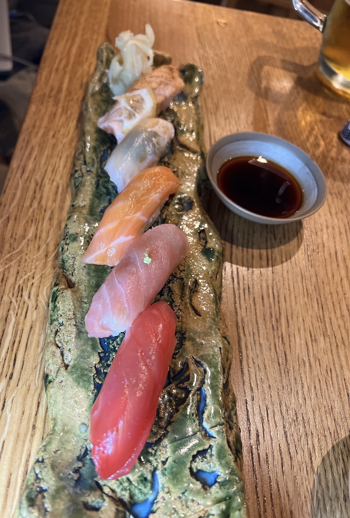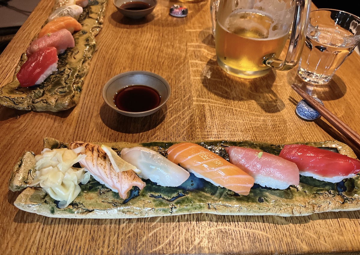 En fait au départ, j’avais cru que les sushis du chef à 29 étaient en nombre habituel et j’avais donc trouvé ça un très bon prix pour d’excellents sushis. En fait une fois que nous les avons commandés, j’ai réalisé qu’ils n’étaient que 5, ce qui fait cher pour des sushis, mais ils étaient tellement délicieux et la bière pas chère que nous avons décidé de choquer la grand voile et d’exploser le budget. En effet au départ, nous devions juste manger un bout avant d’aller au cinéma.