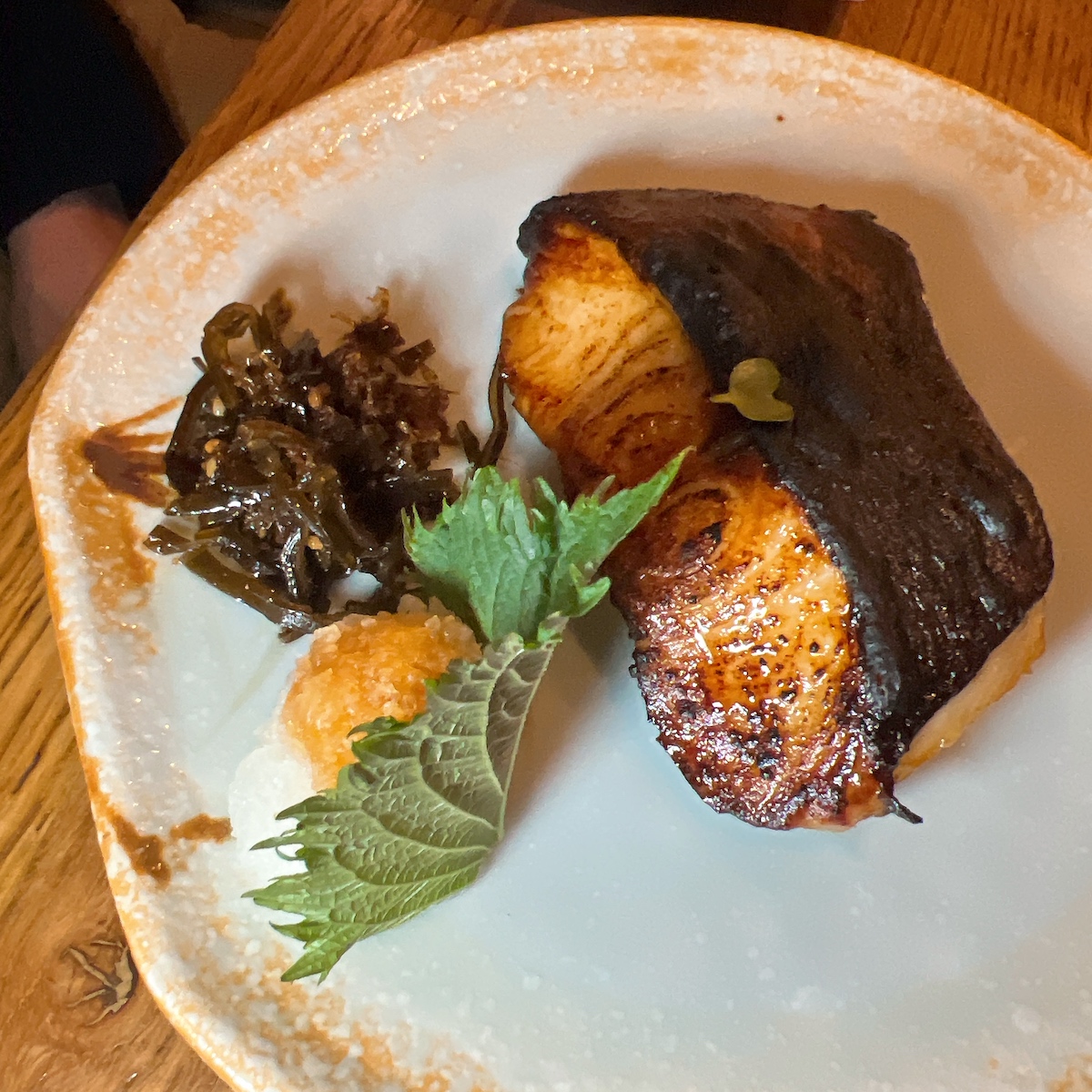 Enfin nous nous sommes laissés tenter par la Gindara Saykio Yaki : morue charbonnière macérée au miso Saikyo puis grillée, excellente 19€