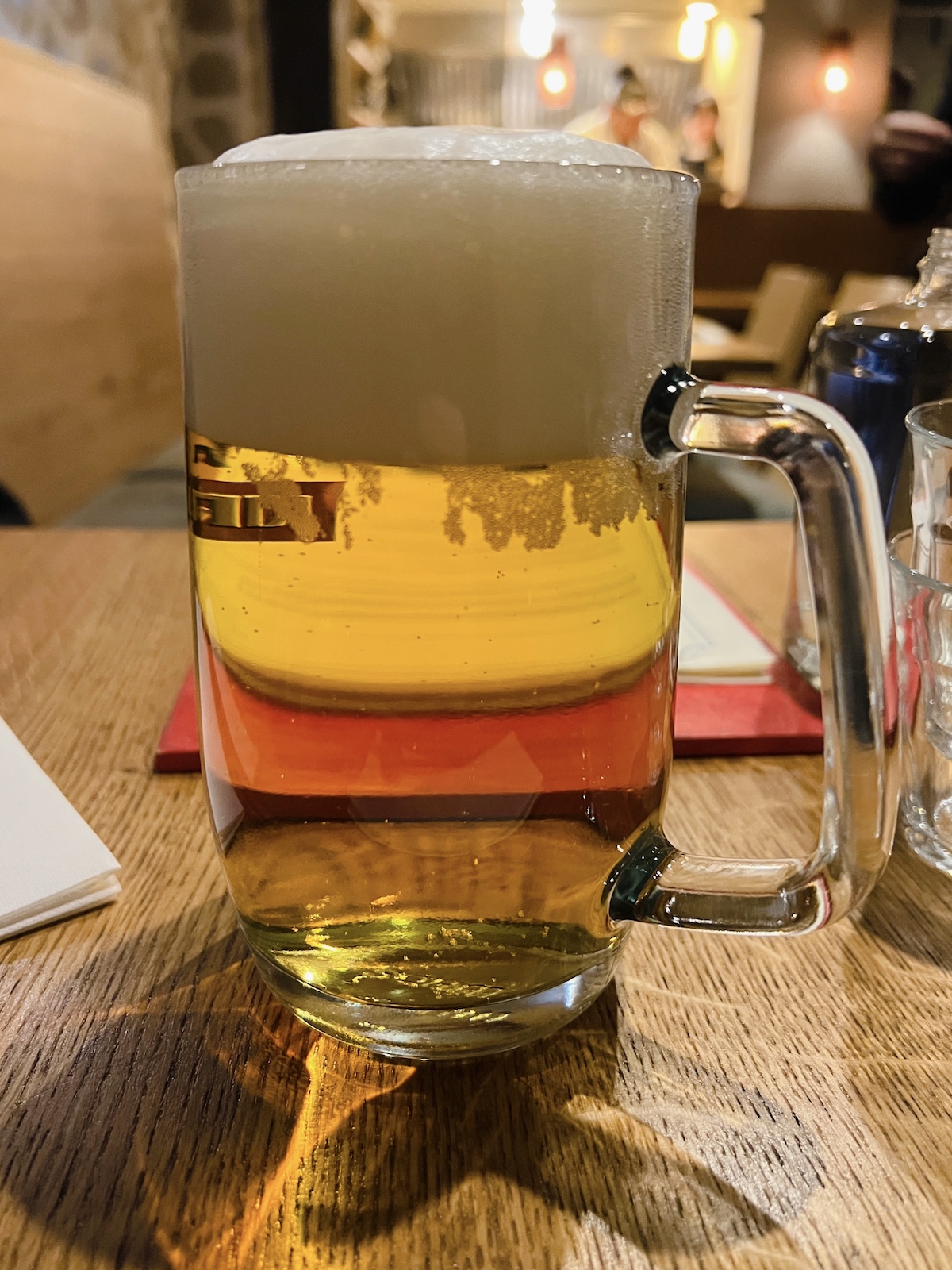 Parlons donc tout de suite de la bière car je viens de l’évoquer et c’est un élément essentiel selon moi, à fortiori dans une izakaya conçue pour boire tout en picorant diverses assiettes. Ici la pinte de Kirin est à 7,5€ en plein quartier Saint-Michel, le soir et hors toute formule, ça, ça montre clairement que l’équipe a fait le choix d’être cool et de permettre de kiffer sans se ruiner; quand on voit que nombre de ramen la proposent désormais à 9 et le demi à 5.
