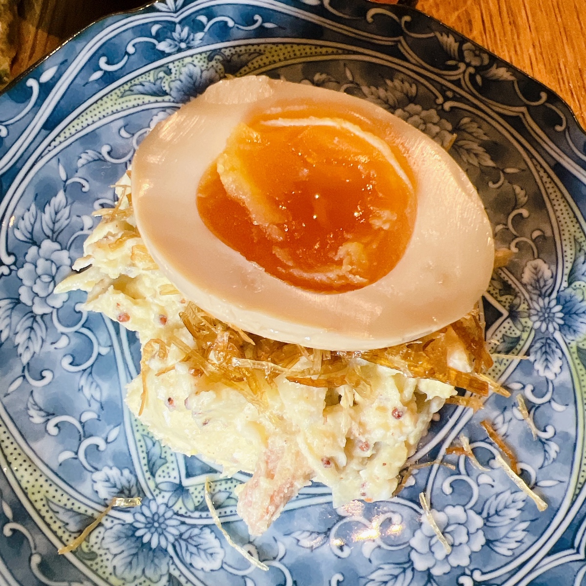 Puis la potesara ajitama : salade de pommes de terre, oignons, lardons avec œuf, nickel et simple 7€