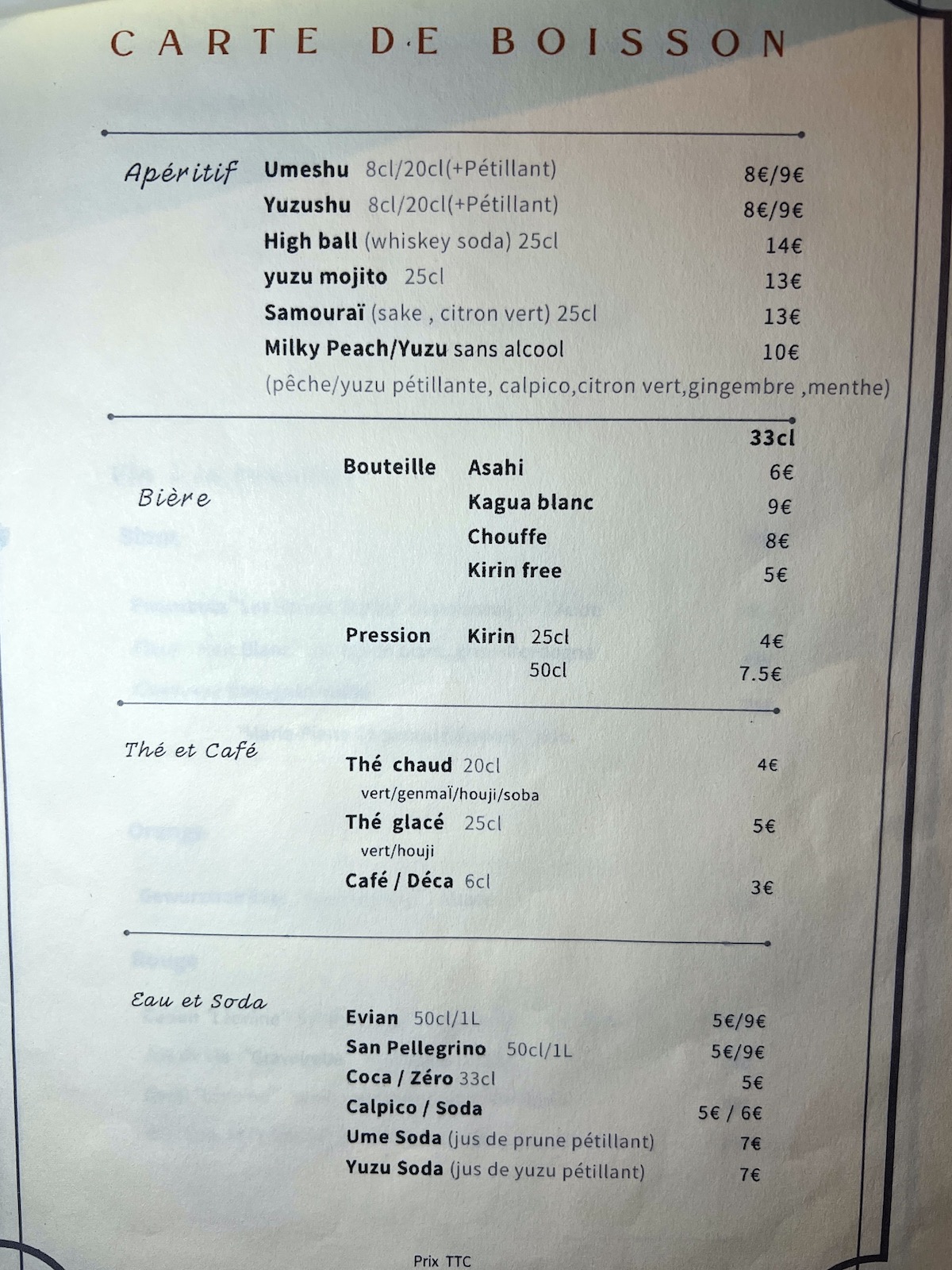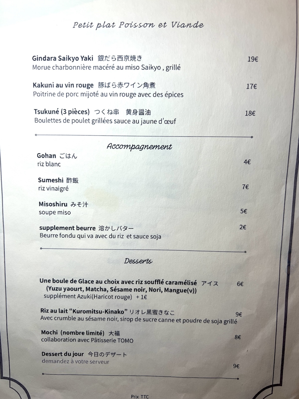 Il faut tout de même savoir qu’il y a deux salles : dans la 1ère, c’est totalement à la japonaise avec un mélange de tables avec chaises, de banquettes basse face à table basse et de chaises face au comptoir, dans la 2ème en revanche c’est une disposition classique de tables avec chaises mais ce soir-là il n’y avait personne dans cette salle bien que la réservation ne nous offrait qu’un créneau horaire à ce moment-là; peut-être qu’ils n’ouvrent pas toujours la 2ème salle ou qu’ils attendent d’avoir beaucoup de monde. Tout ça pour dire que les personnes qui n’aiment pas être assises ailleurs que sur des tables avec chaises doivent être prévenues et peut-être s’assurer au moment de la réservation qu’elles peuvent avoir ces places.