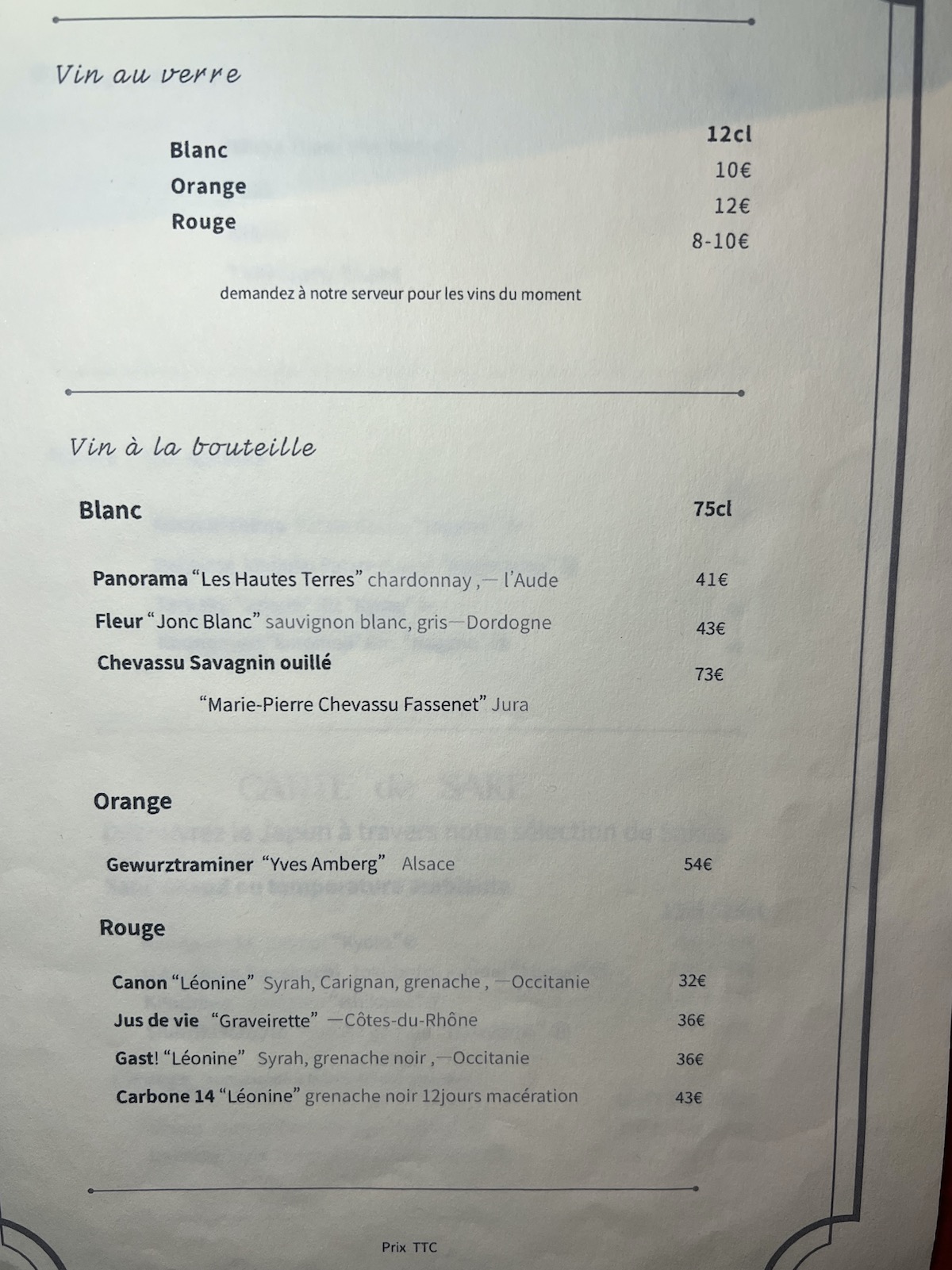 En revanche je trouve les vins au verre trop chers, 10€ le verre de blanc, 12€ de orange, on n’est pas du tout dans le même esprit que pour la bière. Qu’il y ait des verres à ce prix-là aucun soucis, mais il faudrait une entrée de gamme à 8, ce serait top. Pareil une bouteille dans les 35 en premier prix serait bienvenue. Je comprends qu’ils ne puissent pas tout maîtriser mais on aurait tellement envie d’une courte carte de vins nature ou apparentés, bien sentie, qui donne envie de se lâcher.