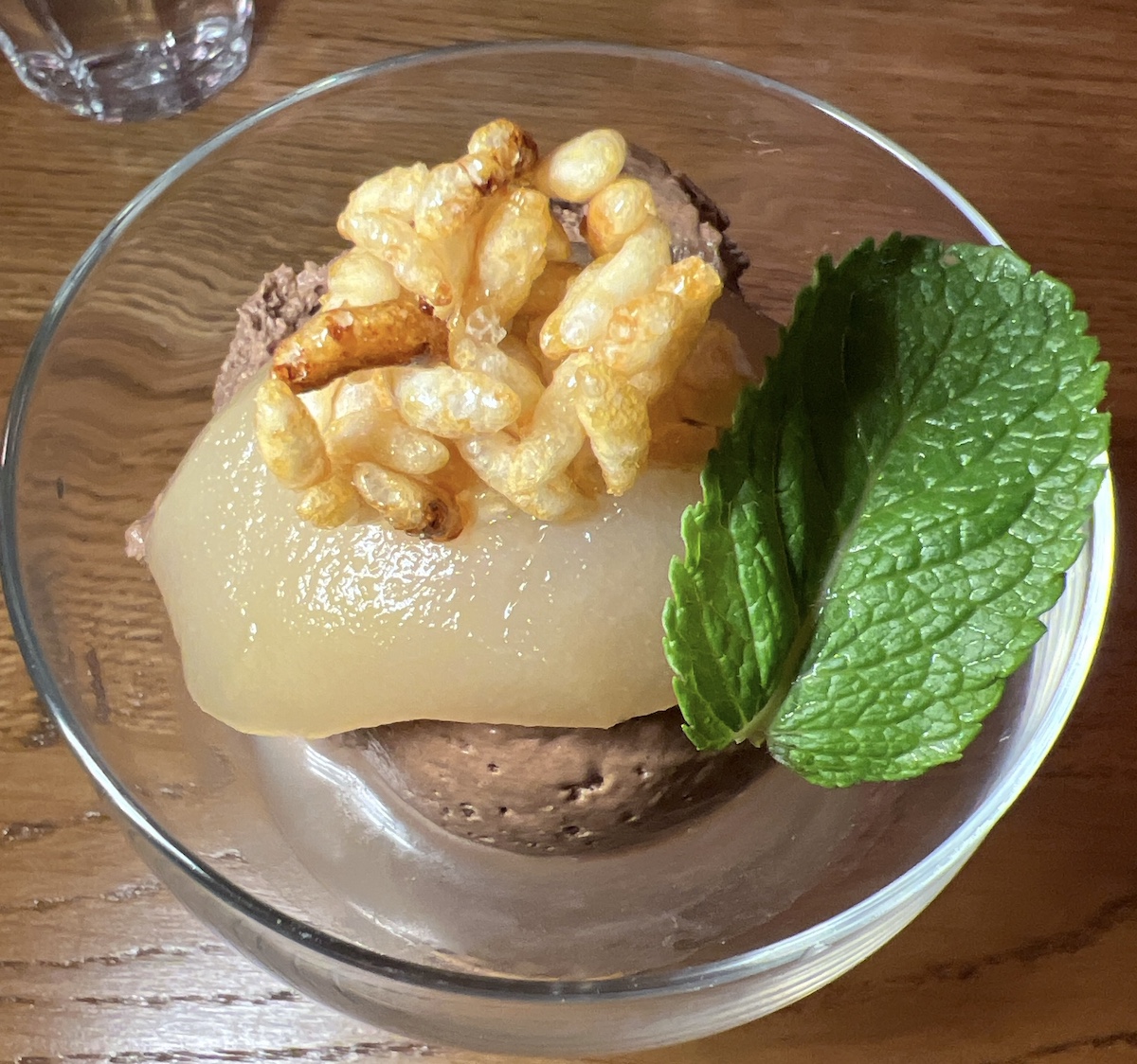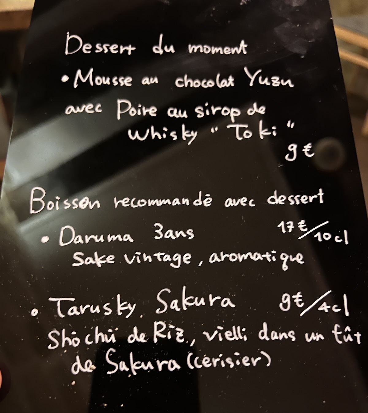 Avec tout ça on s’est laissé tenter par le dessert, une mousse au chocolat Yusu avec poire au sirop de whisky “Toki”