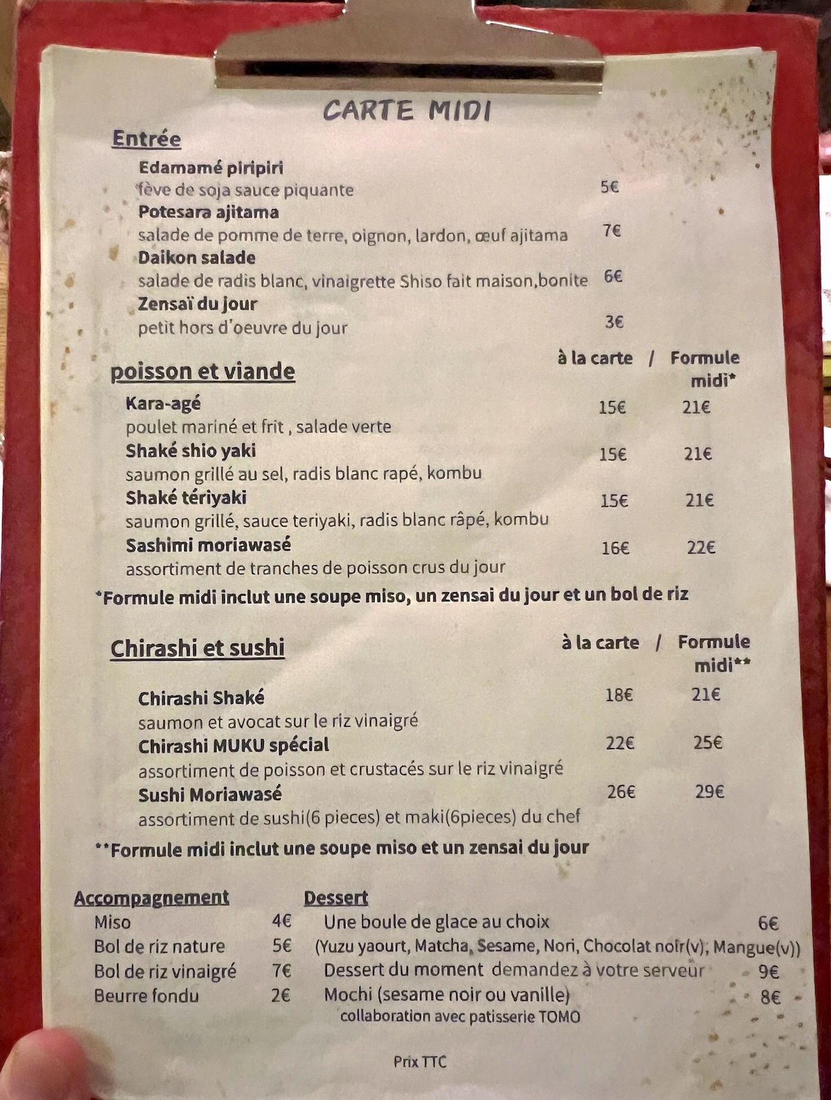 La carte pourrait être plus propre. En tout cas les formules déjeuner avec soupe miso, zensai (entrée) et plat autour de 20-25€ font envie. Nous sommes partis sur un Sashimi Moriawasé et un Chirashi MUKU spécial.