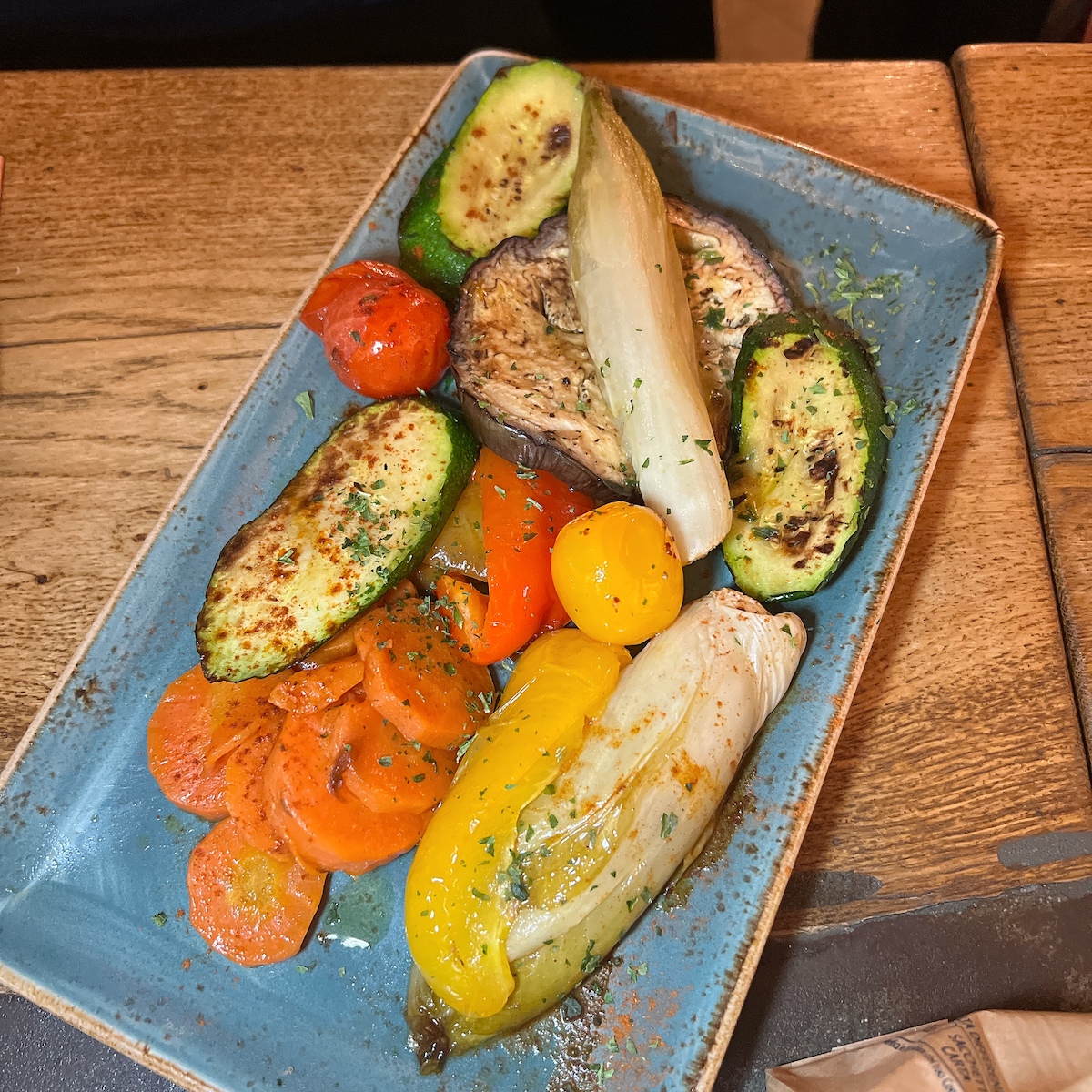 Enfin le plat du jour : bar aux légumes. Tout était parfait mais il était un poil surcuit, je l’ai dit, le patron m’a spontanément dit qu’il l’avait vu et m’a proposé de me le refaire (j’ai dit oui), là il était parfait