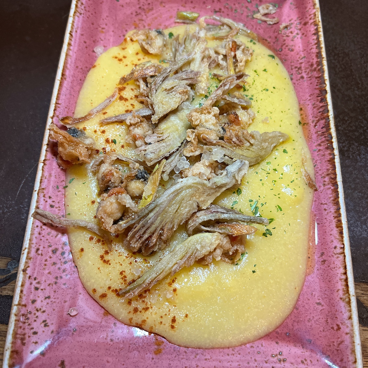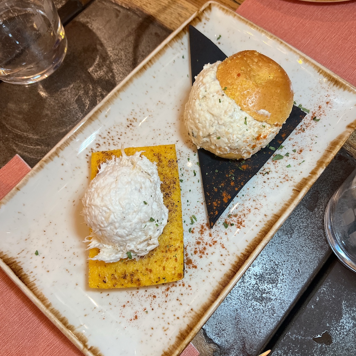 Je ne me souviens plus de l’intitulé mais c’était de la Baccalà mantecato (morue à la crème) avec petit pain et polenta