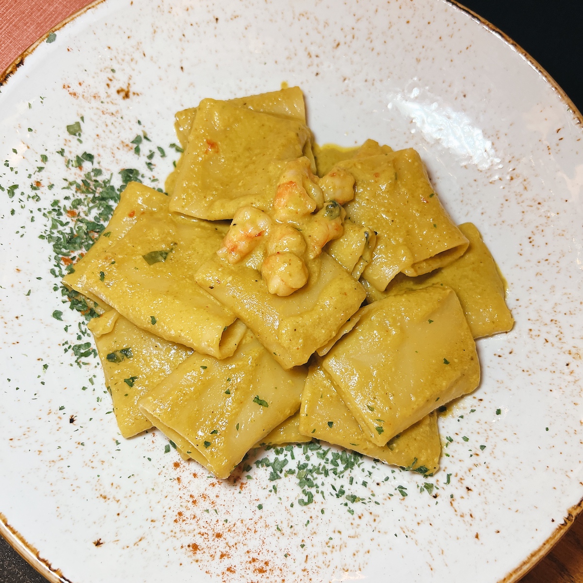 Lasagnola del pescatore (lasagne du pêcheur) : crevettes, poisson blanc et radicchio de Trévise