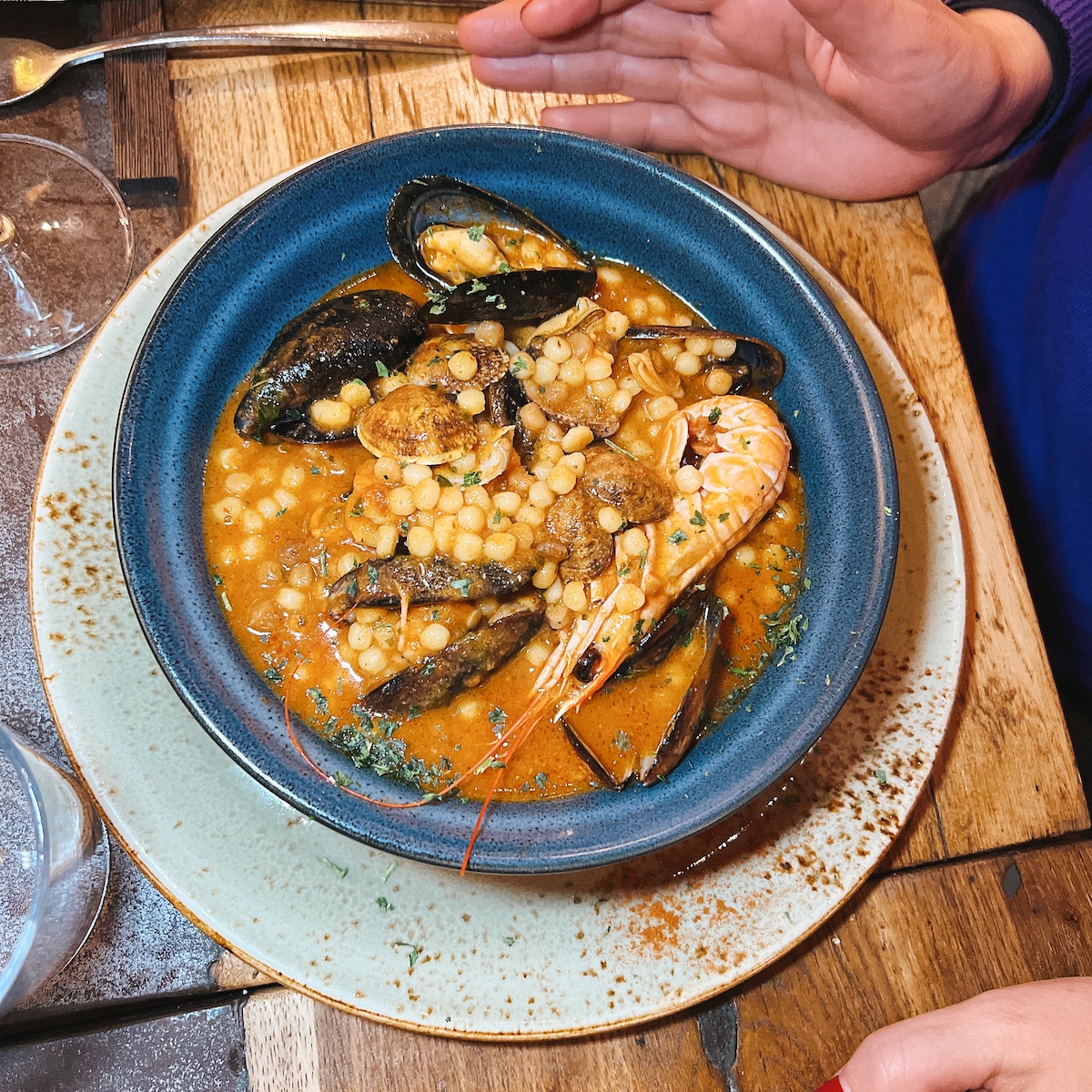 Fregola sardes servies dans un Guazzetto de fruits de mer avec moules, palourdes, poisson du jour et crustacés