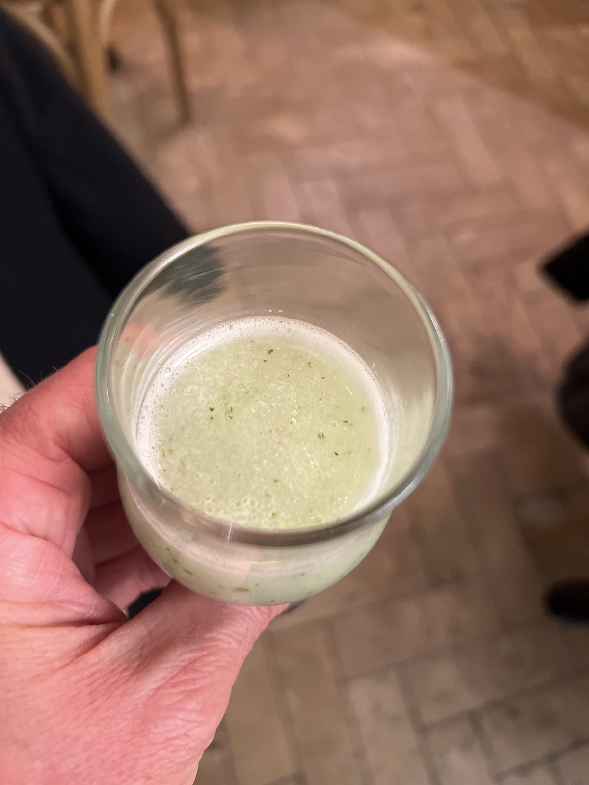 Ca c’est fantastique, un digeo à la glace merveilleux : un Sgroppino “El Nevodito”. Le sgroppino est originaire de Venise, un mélange de cocktail et de dessert composé de citron jaune, citron vert, mente, prosecco et rhum blanc, terriblement additif.