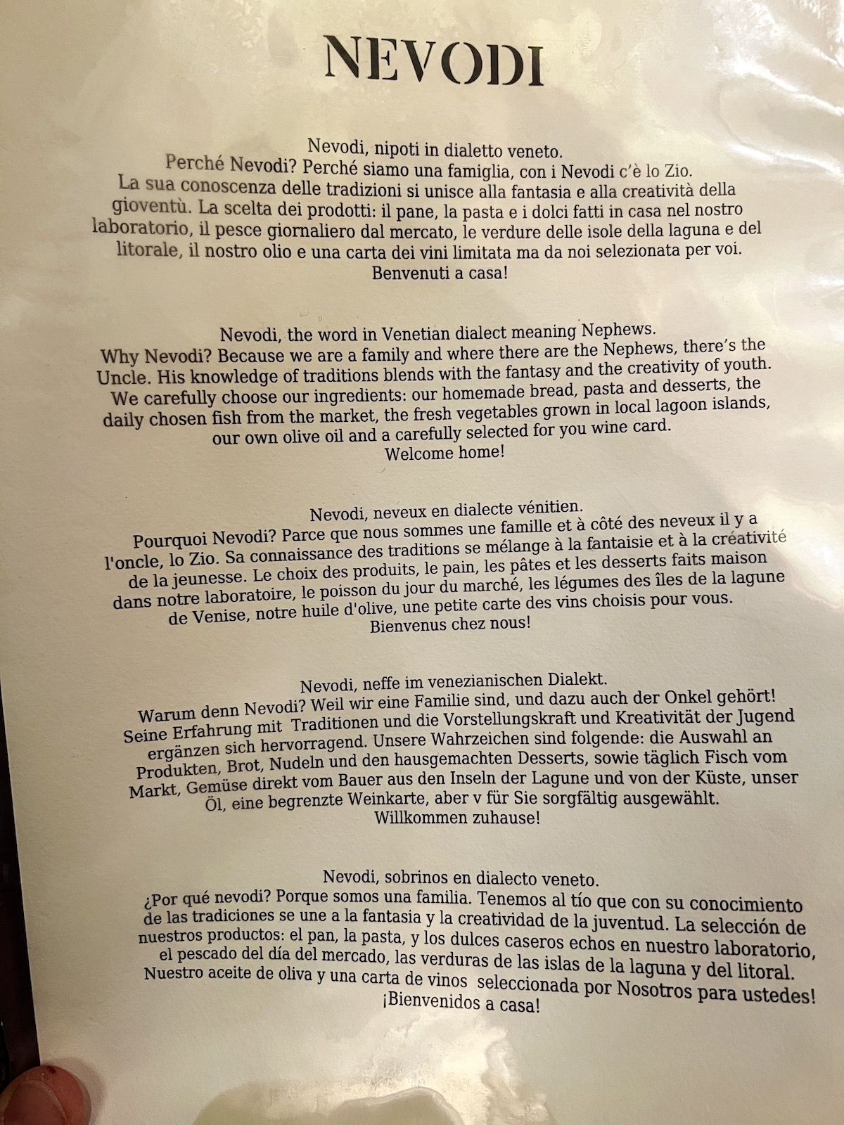 Le resto à faire sans hésiter à Venise, en 2026, c’est Nevodi. Complet tout le temps le soir, on trouve de la place le midi facilement mais en réservant.