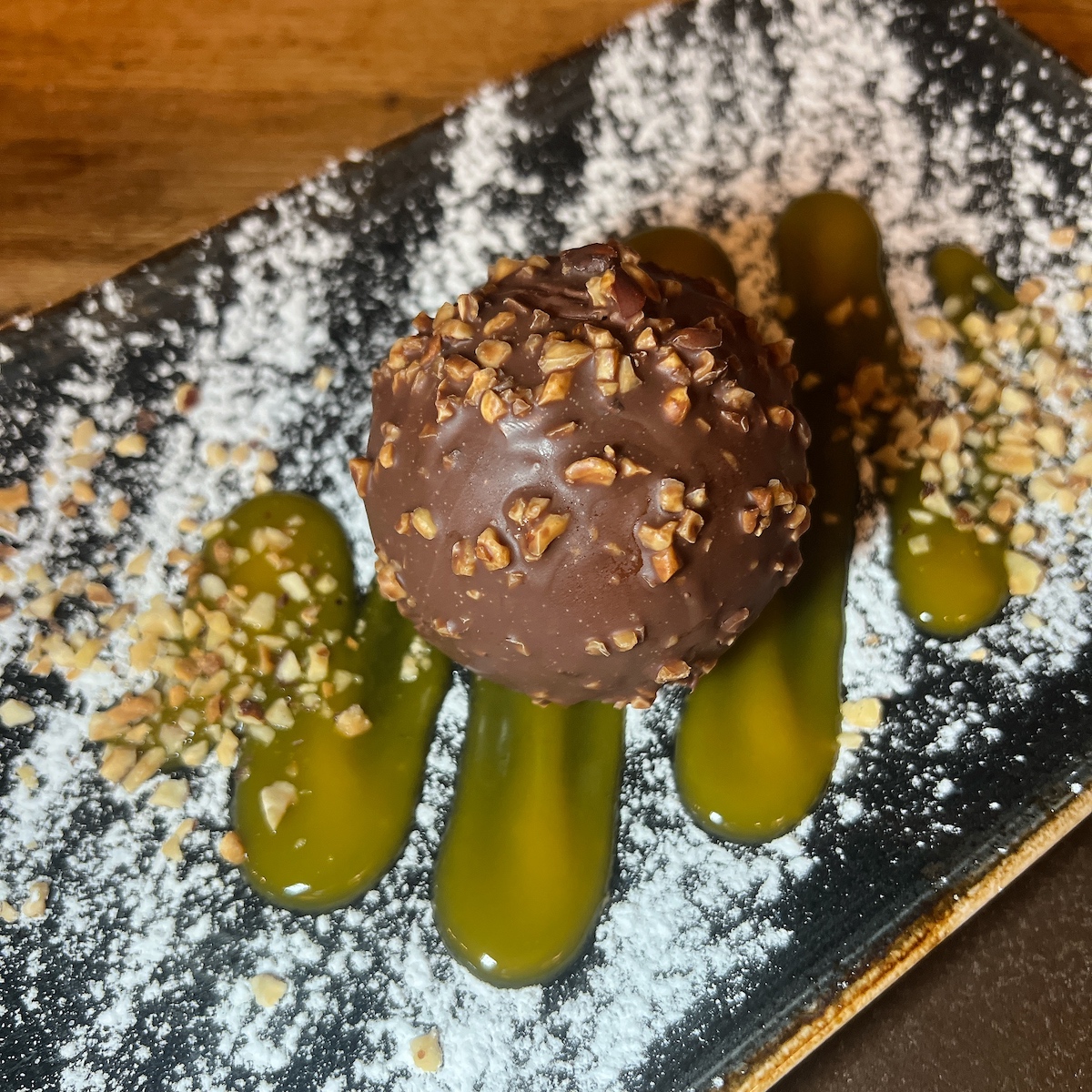 Nevodi rocher (sphère croustillante avec mousse de noisette et coeur de chocolat, coulis de mangue et fruits de la passion)