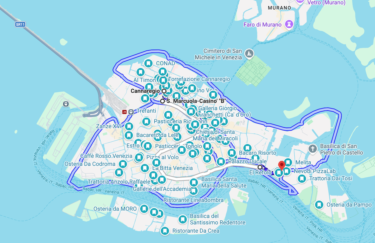 Depuis le Cannaregio on peut y aller à pied mais ça fait une trotte, sinon on peut prendre un vaporetto soit par la gauche de la ville, soit par la droite (cf les deux lignes bleues ci-dessous), cette deuxième option est super car on remonte ensuite le Rio di San Anna à pied jusqu’au resto.