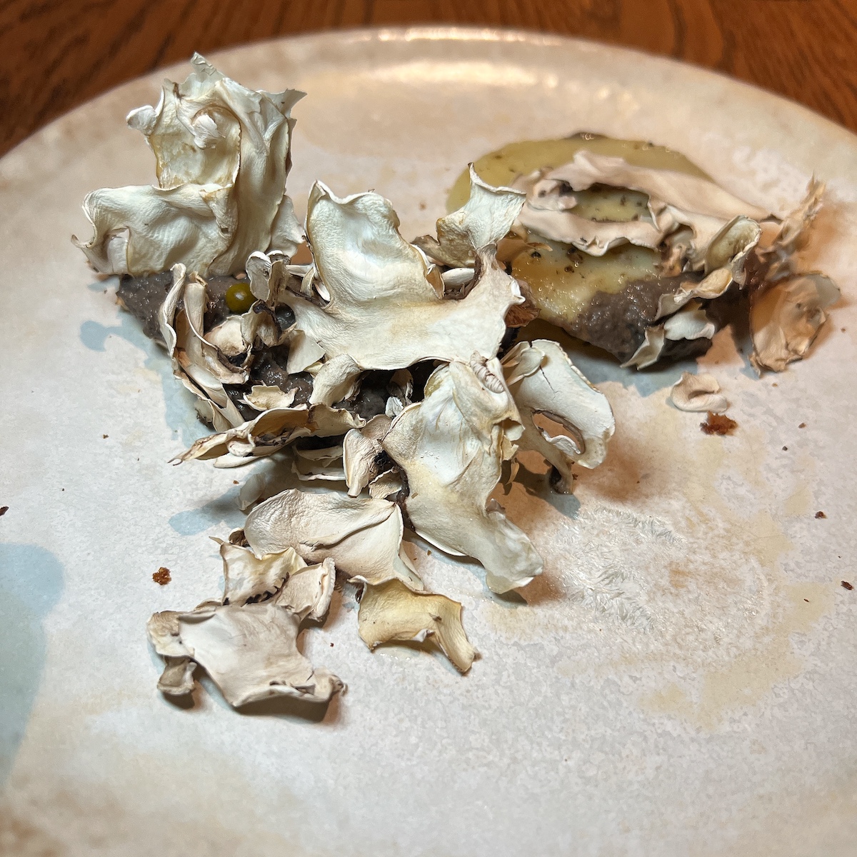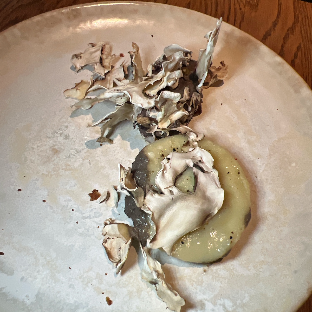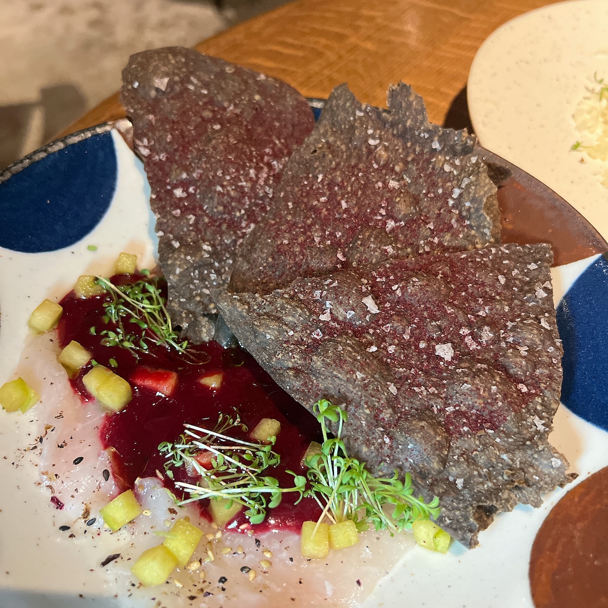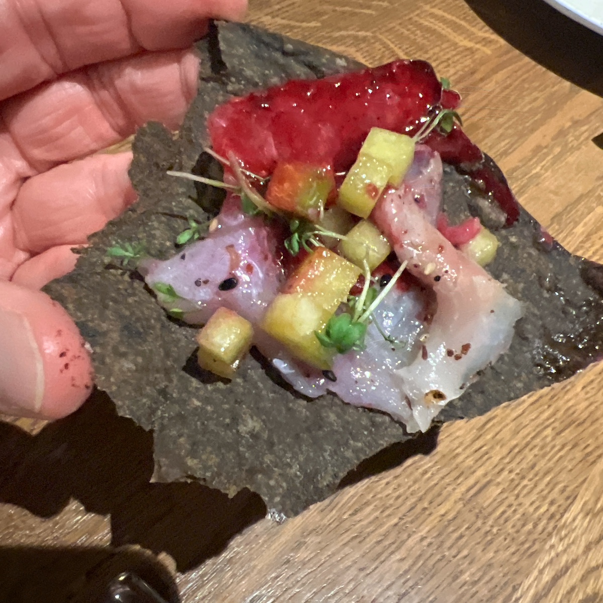 Carpaccio de daurade avec sauce au cassis, menthe, pomme, servi avec une fine galette croquante à l’huile d’algue, recouverte de sel : super bon et super intéressant, on ne surjoue pas l’acidité comme trop souvent pour ces carpaccios de poissons qui veulent imiter des ceviches sans trop savoir comment, ici il y en a mais cela reste léger, disons que cela accompagne et surtout, c’est l’exact opposé du tartare, on a visiblement laissé le poisson à température si bien qu’on en sent toutes les nuances de goût, il n’est pas écrasé par le froid. J’ai aussi trouvé ça super original et bienvenu de le servir avec ces fines galettes croquantes, cela se marie très bien.