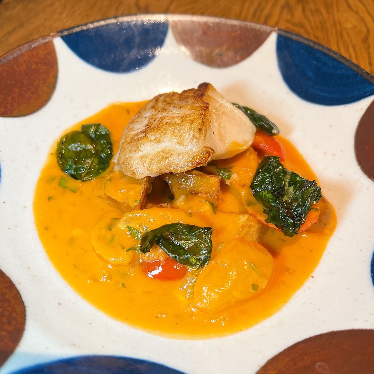 Cabillaud super bien cuit mais trop salé, bonne sauce aux tomates cerise