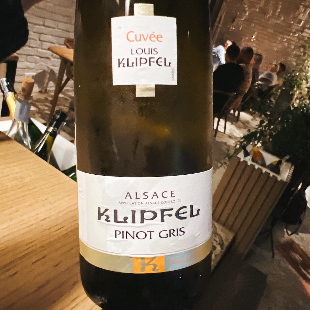 Nous sommes arrivés à l’heure mais notre table n’était pas dispo. Pas grave, mais on ne nous a pas dit où attendre, on était dans l’entrée debout dans le passage face au comptoir d’accueil, j’ai alors demandé un vin blanc, on m’a conseillé ce Pinot gris de Louis Kipfel.