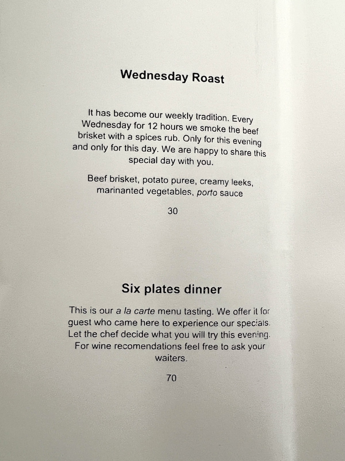 Le menu dégustation de 6 plats est à 70€. Il n’y a pas d’accord mets-vins proposé mais le manager m’a expliqué qu’ils proposent généralement 4 verres, je lui ai demandé pour combien il y en aurait, il m’a répondu : « autour de 30 », ce qui va.