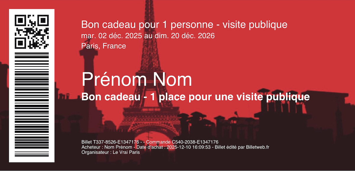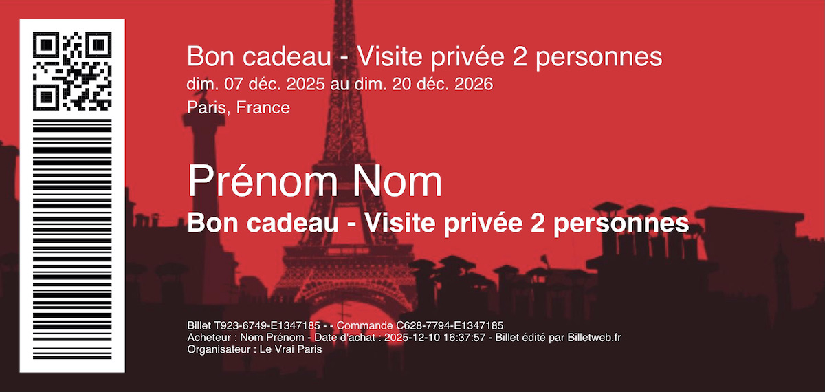 Bon pour une visite privée pour 2 personnes en ma compagnie, la thématique est à choisir parmi celles proposées sur Le Vrai Paris.