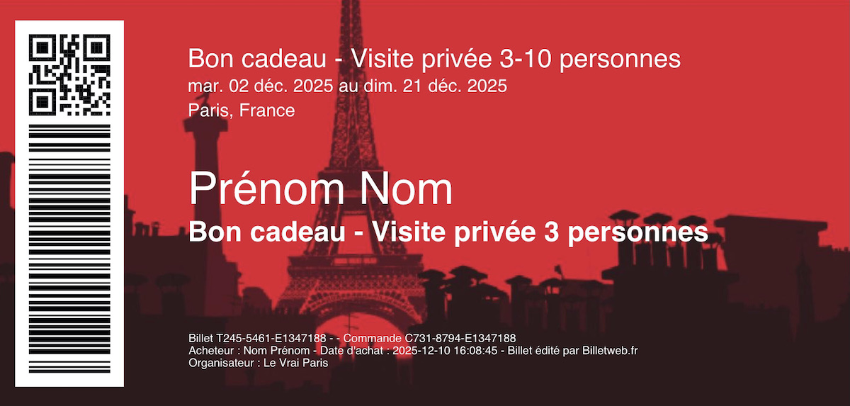 Bon pour une visite privée pour un groupe de 3 à 10 (tarifs pour 3, 4-5, 6-7 et 8-10) personnes en ma compagnie, la thématique est à choisir parmi celles proposées sur Le Vrai Paris.