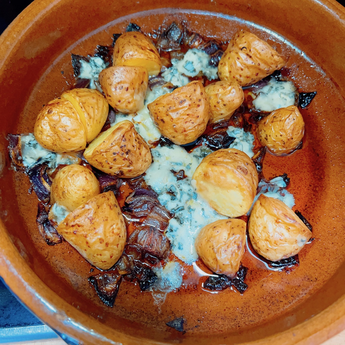 Un reste d’oignon rouge à finir avant les vacances, un bout de bleu apporté par des potes, il te reste à choper de belles patates, nouvelles si possibles. J’ai vraiment bricolé en fonction de ce qu’il restait dans le frigo et me suis aidé de cette recette très cool de littlepotatoes.
