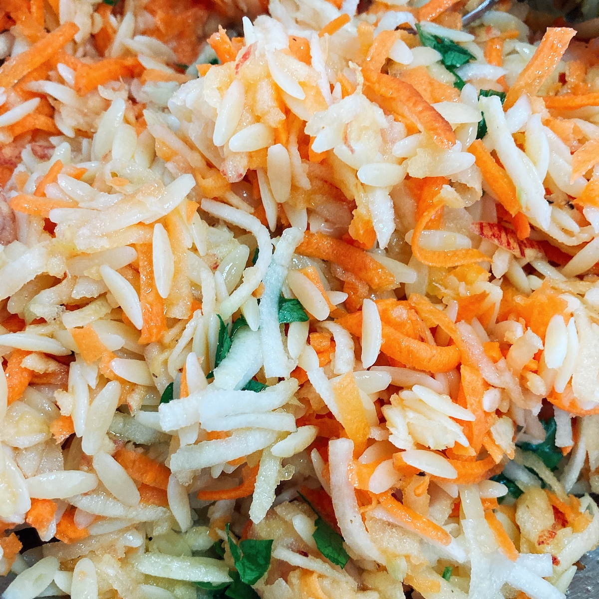 Pendant la cuisson des pâtes, je rince ma pomme et je la râpe sans l’éplucher avec la grille à gros trous de ma râpe puis je la mélange au chou rave et à la carotte déjà râpées. Une fois les pâtes cuites, je les rince à l’eau froide et je les ajoute à la salade.