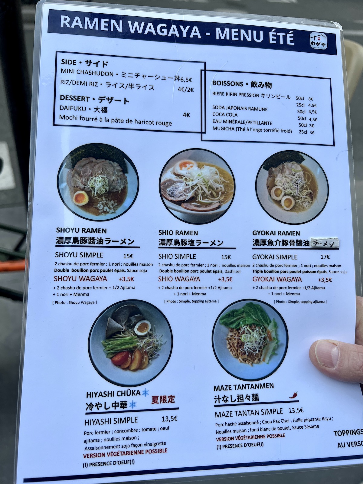 J’ai pris un gyokai ramen car je n’en avais encore jamais vu à Paris : le bouillon est à base de porc, poulet et poisson, un régal : 17€ et 3,5 pour les Gyokai, les toppings. J’ai cru que c’étaient des accompagnements mais non, c’était dans la soupe, enfin au-dessus.
