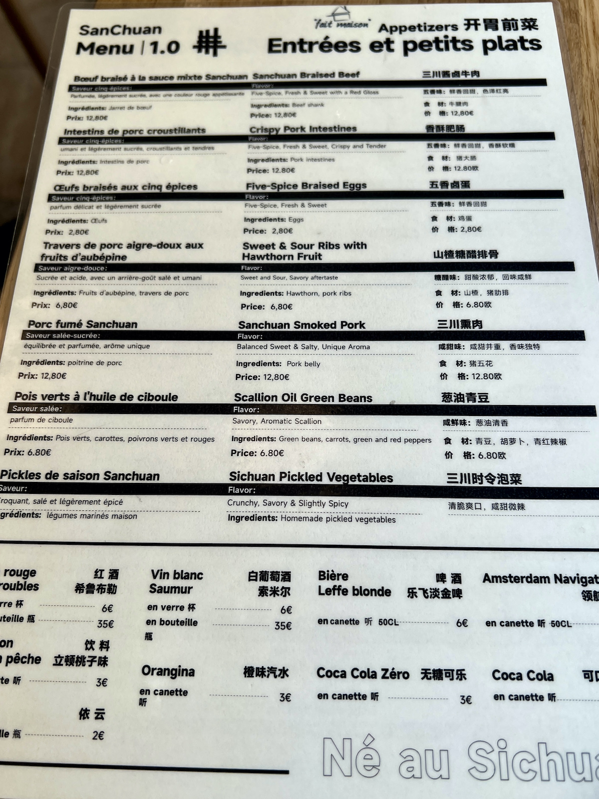 Le menu est simple, les plats principaux sont tous des nouilles ou des raviolis. En entrée, je voulais essayer des intestins de porc croustillants, mais il n’y en avait pas en ce 14 juillet. Pareil pour la bière, je trouvais ça cool qu’enfin un resto chinois propose autre chose que de la Tsing Tao, mais en l’occurrence c’était de la Leffe (qui ne m’intéresse pas, encore moins pour manger) et de l’Amsterdam Navigator (en fait, ça ne m’intéresse pas non plus, une bière à 8°). De toutes façons, il n’y avait aucune des deux, mais seulement… de la Tsing Tao.
