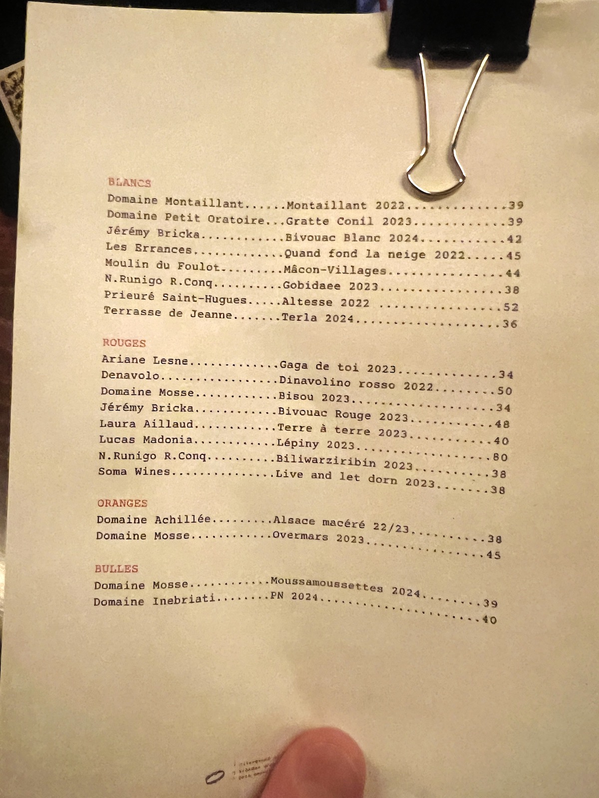 Prix des bouteilles de blanc entre 36 et 52, de rouge entre 34 et 50. Ce serait cool d’avoir une entrée de gamme un peu moins chère, cela permettrait je pense de revenir plus souvent et plus spontanément.