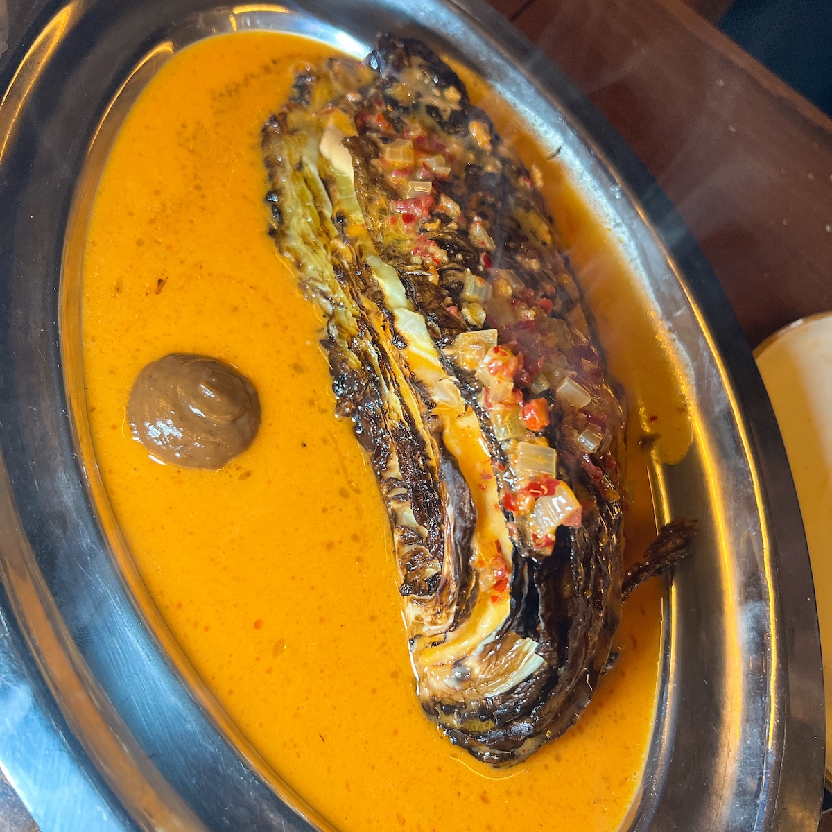 Chou pointu, tamarin, beurre blanc nduja, cacahuètes 17€